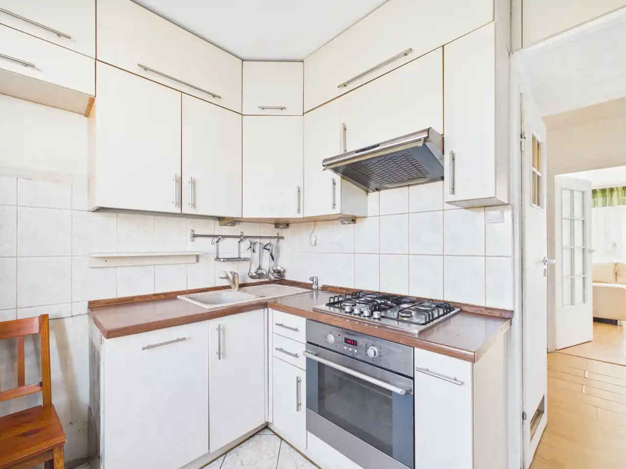 Kuchnia w zabudowie, wyposażona w kilka sprzętów AGD.