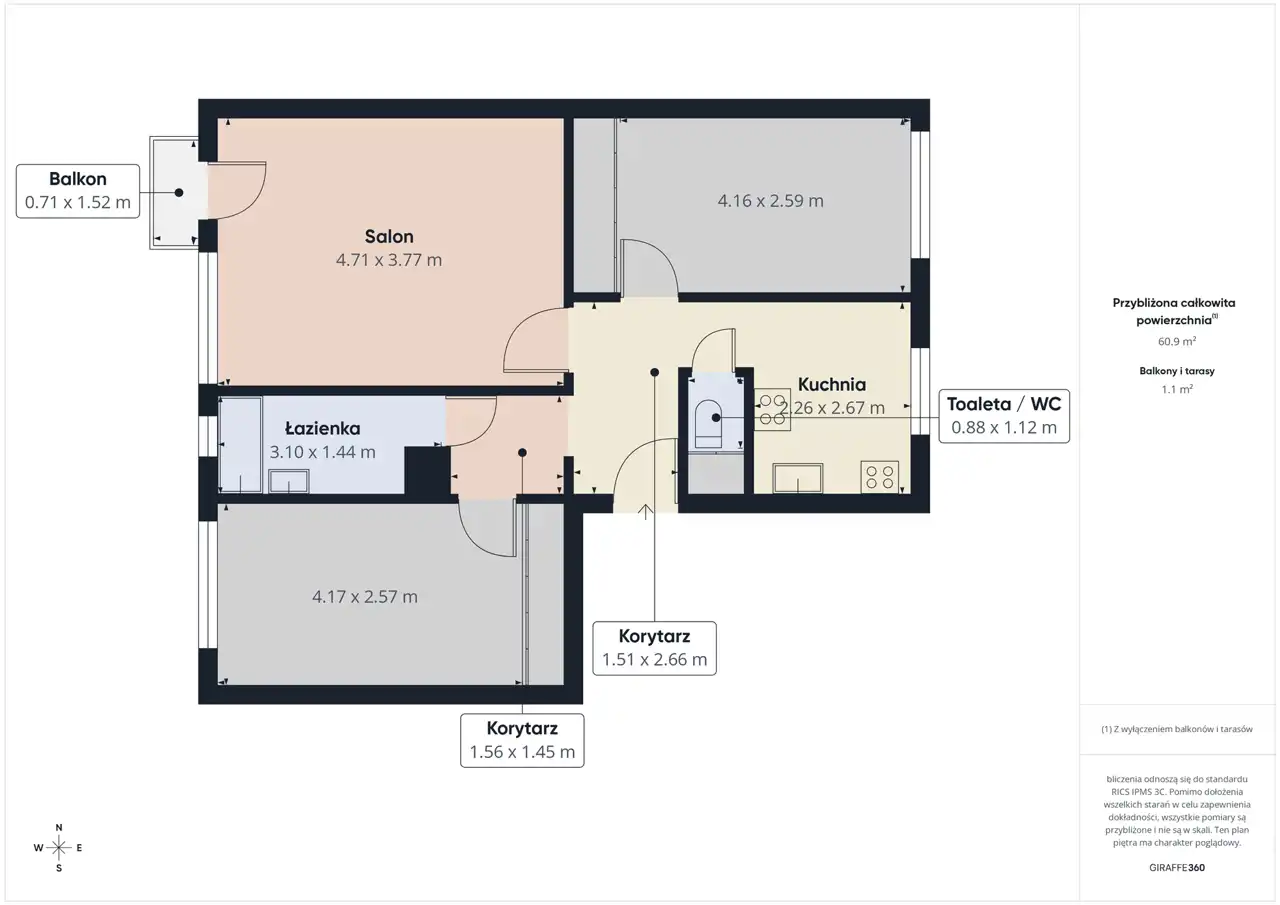 - Charakterystyka mieszkania 60.4 m2, 3 pokoje