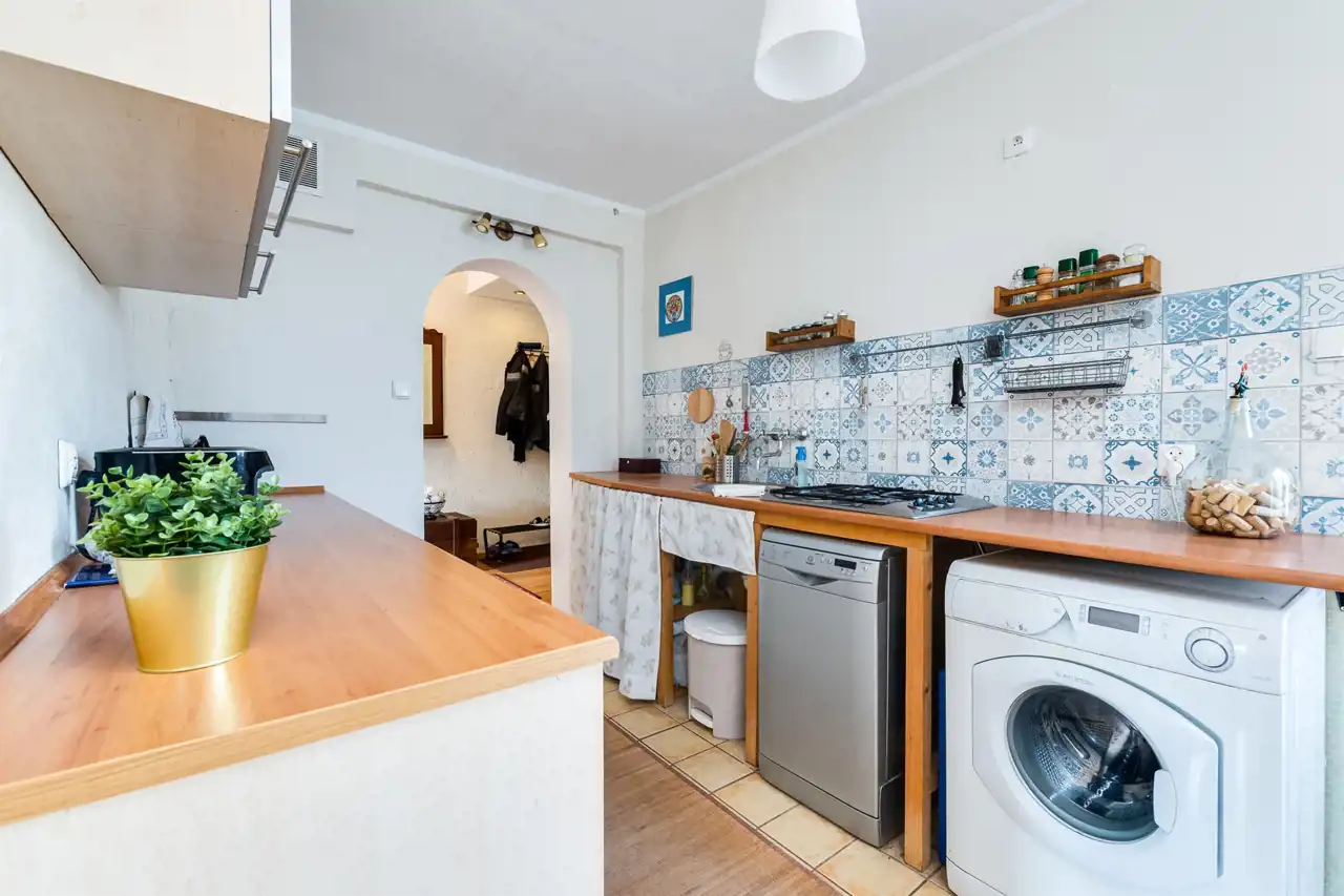 Na podłodze w pokojach znajdują się panele, na ścianach zaś gładzie i wygodne tapety. Przedpokój, kuchnia i łazienka wyłożone są terakotą. Kuchnia wyposażona w zabudowę kuchenną, a w skład sprzętów AGD wchodzi m.in. płyta gazowa, piekarnik, zmywarka, lodówka czy pralka. Kuchnia przestrzenna i widna (z oknem). Łazienka mieści tylko kabinę prysznicową, zaś toaleta umywalkę, wc oraz miejsca na przechowywanie niezbędnych akcesoriów łazienkowych.