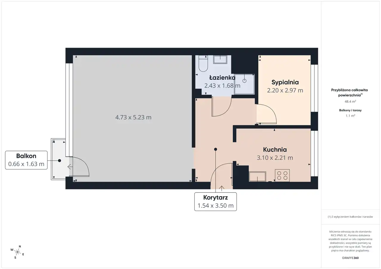 - Charakterystyka mieszkania 48.7 m2, 2 pokoje
