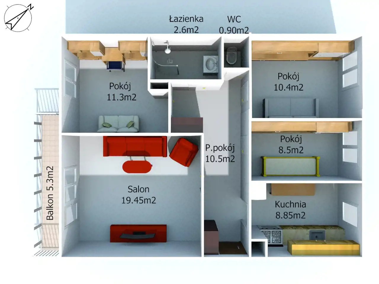 Rozkład pomieszczeń został przedstawiony na rzucie 3D. Strony świata: od strony salonu oraz jednego z pokoi - południowy - zachód, natomiast od strony kuchni i dwóch pozostałych pokoi - północny - wschód.