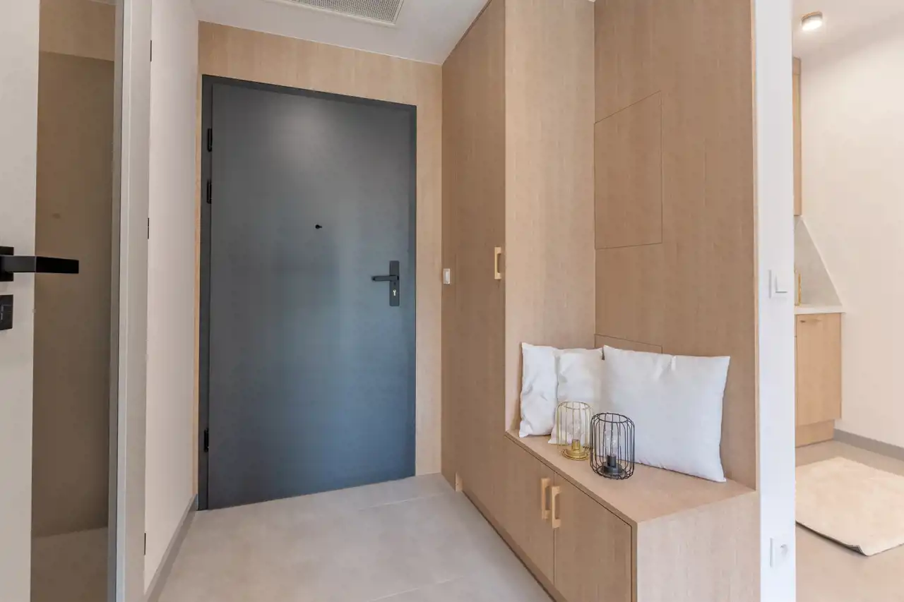 - Hol z zabudowaną szafą, siedziskiem i nowoczesnym wideodomofonem w którym jest również podgląd do kamer.