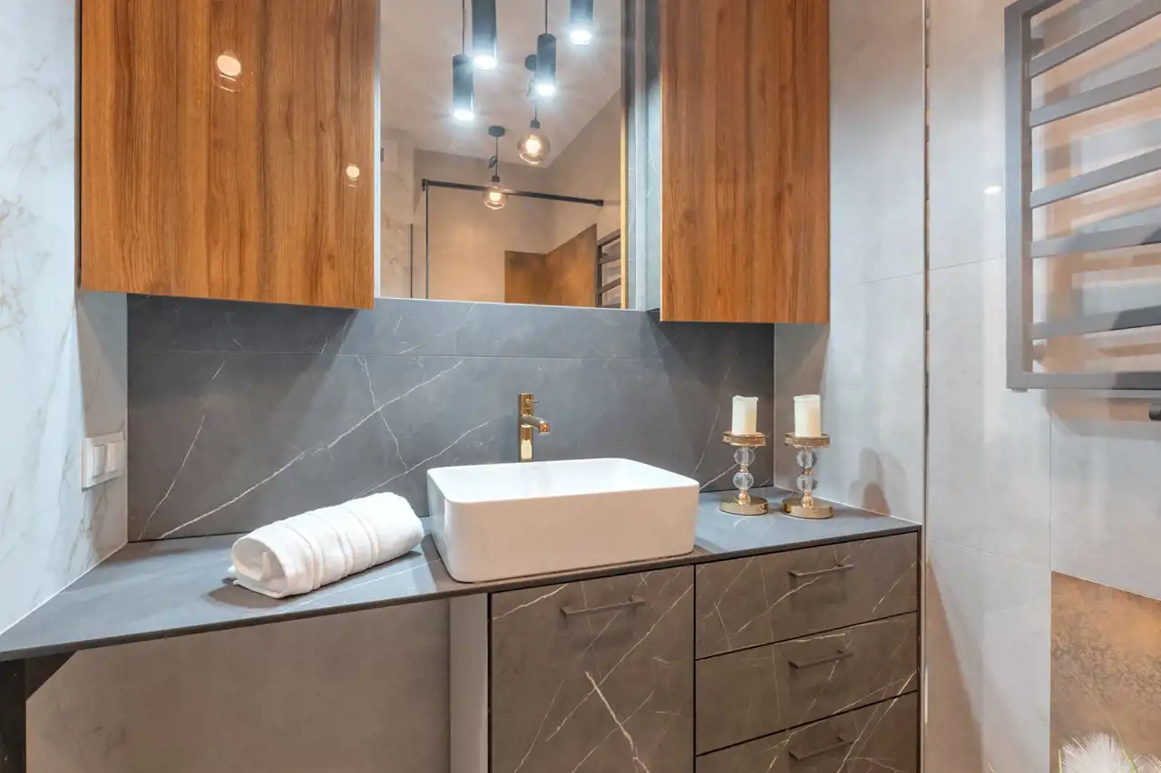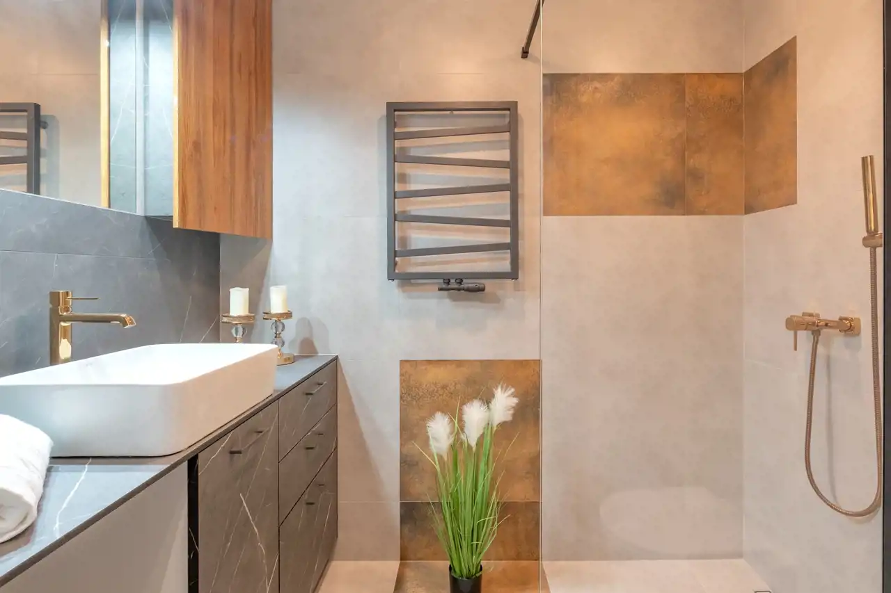 - Łazienka z otwartą kabiną prysznicową i zabudową ścienną wykończoną wysokiej jakości płytą HPL.