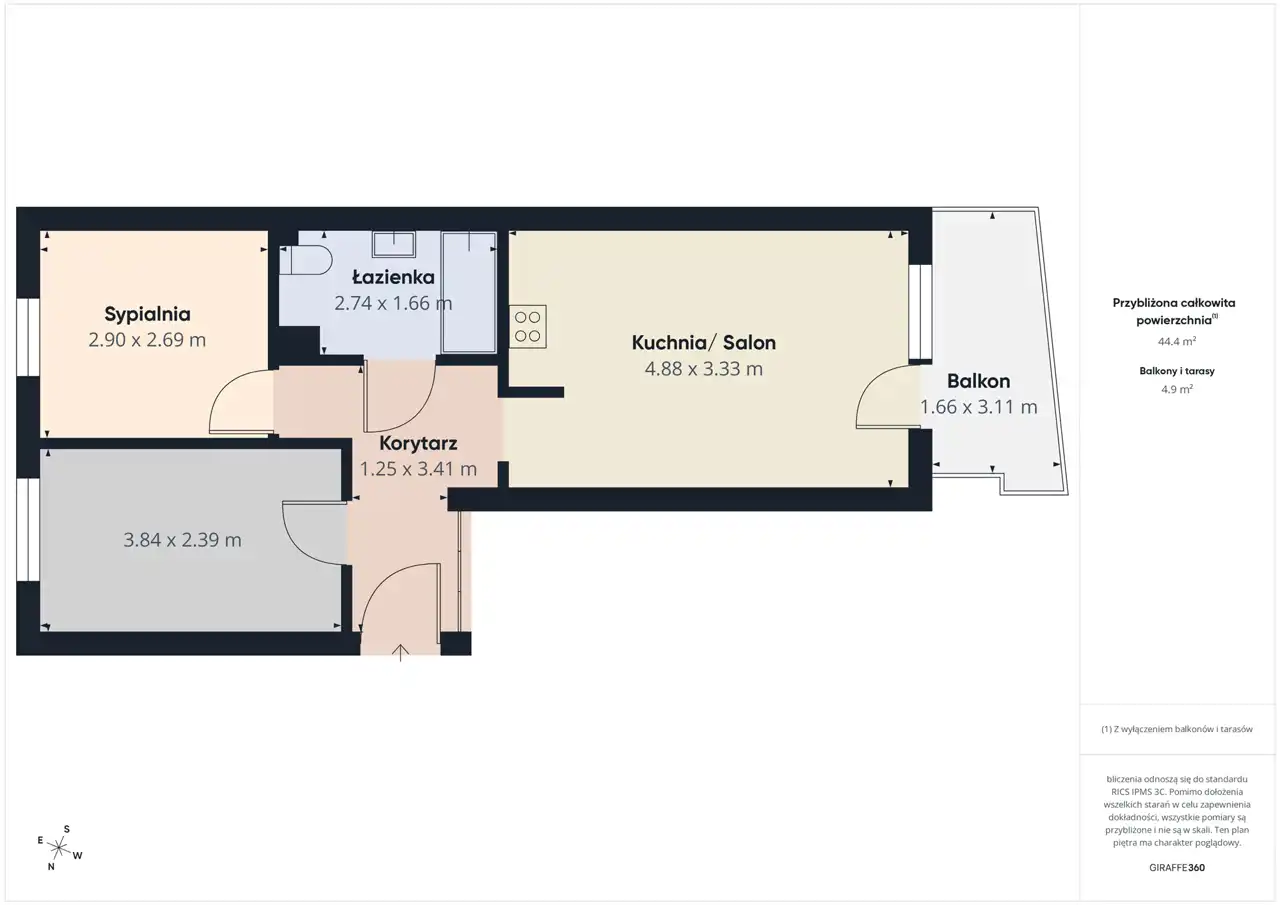 Posiada ono powierzchnię użytkową 44,65 m2 i składa się z: