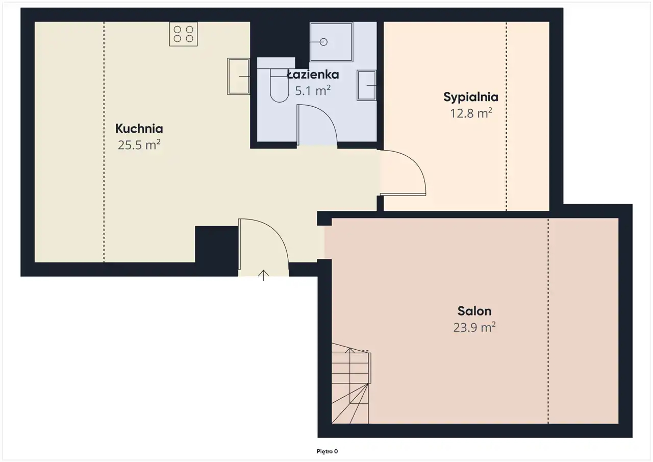 Poziom pierwszy obejmuje przestronną sypialnię, salon, oddzielną kuchnię z częścią jadalnianą, przestronny hol oraz łazienkę — jego powierzchnia całkowita wynosi 67,3 m², z czego 50,7 m² to powierzchnia użytkowa.