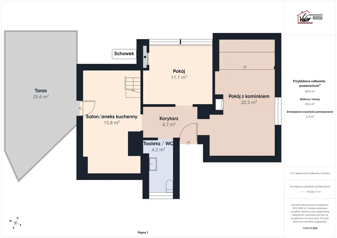 - salon z aneksem kuchennym o powierzchni 15,80 m² z wyjściem na przestronny taras o powierzchni 25,60 m²;