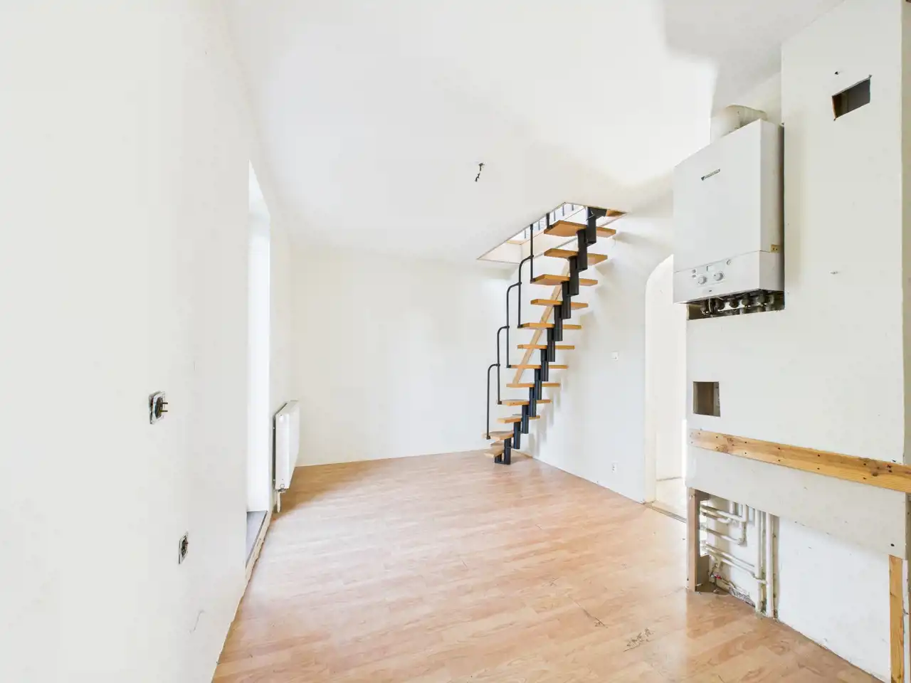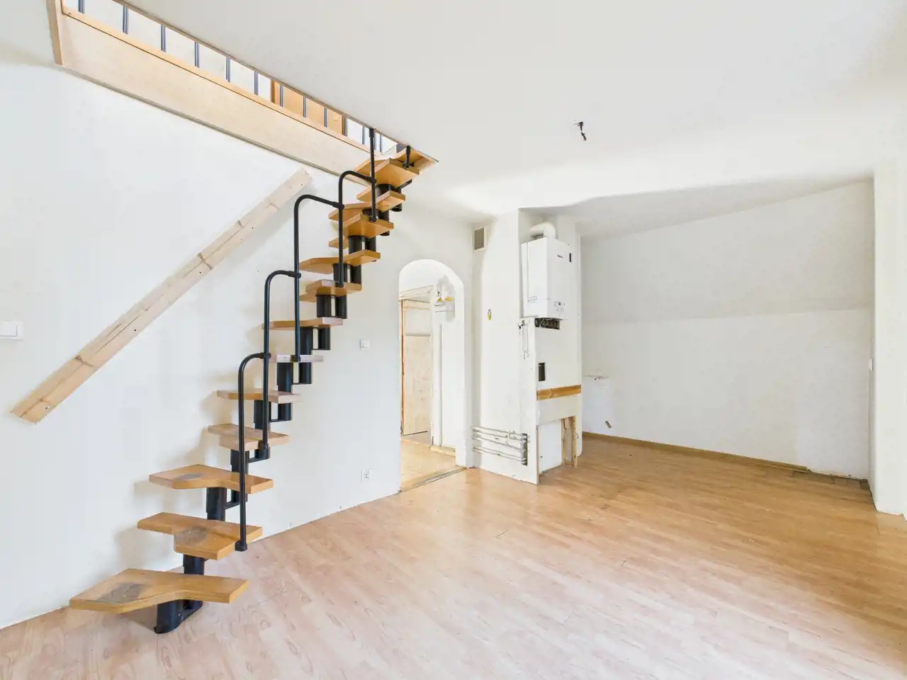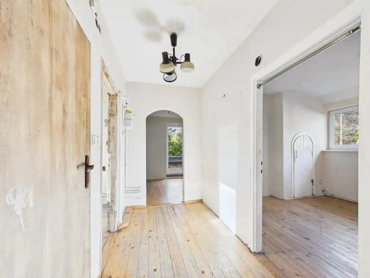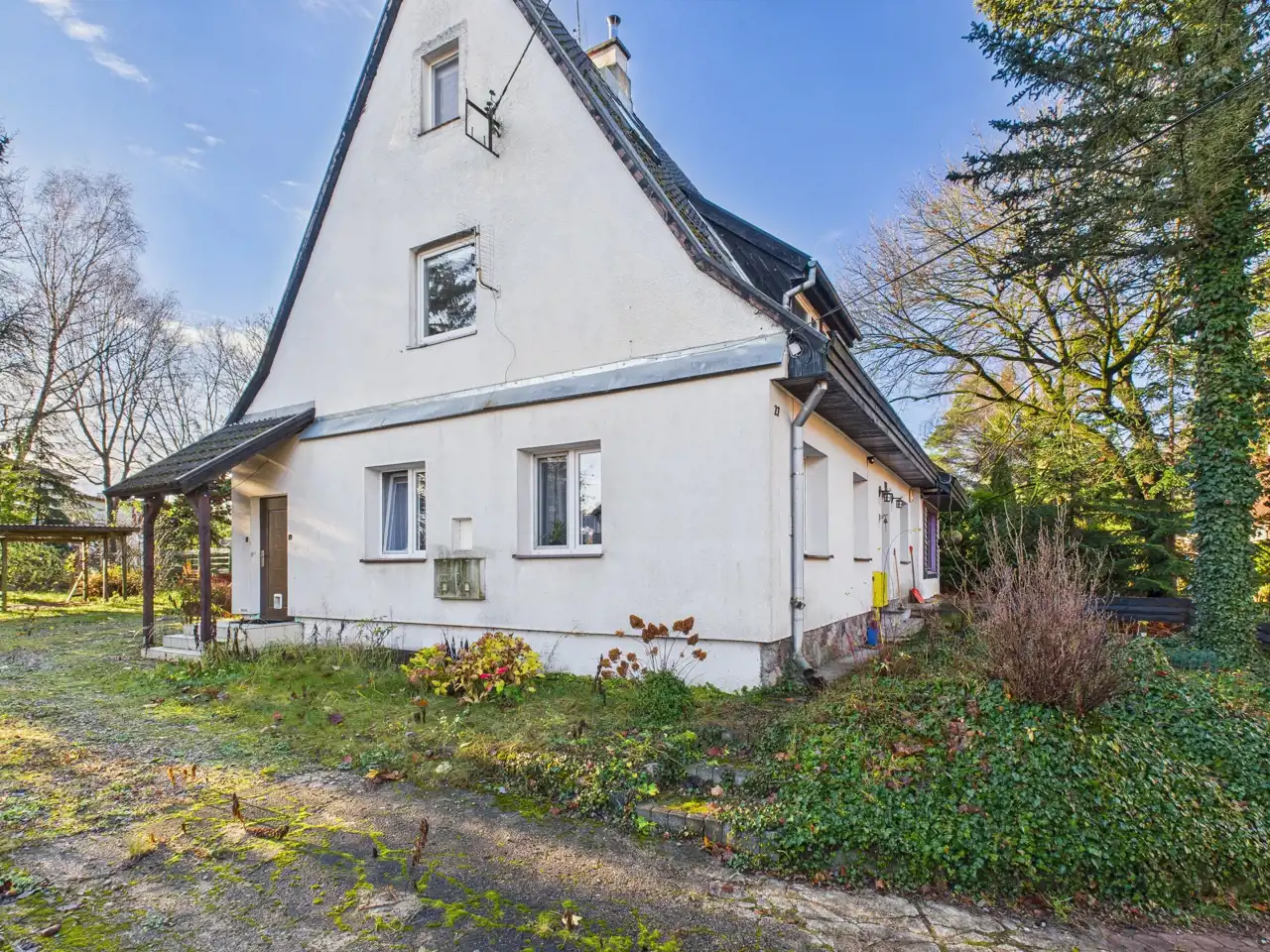 Dwupoziomowe Mieszkanie do własnej aranżacji o łącznej powierzchni całkowitej 92,6 m2 zostało usytuowane w budynku jednorodzinnym z 1942 roku. Do mieszkania przynależy w udziale działka o pow. około 542 m2. Działka ogrodzona, na której znajduje się wiata jako zadaszone miejsce na samochód. Również znajdują się duże dwie piwnice. Cała powierzchnia dwupoziomowego mieszkania (pół domu) została usytuowana na piętrze o powierzchni użytkowej 92,6 m2, która składa się z: