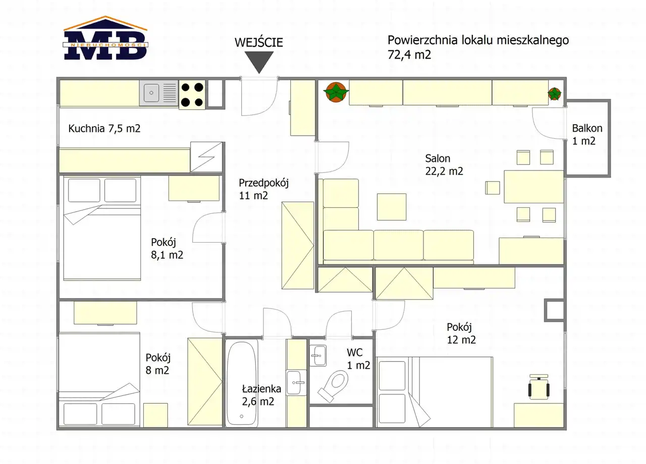 - Charakterystyka mieszkania 72.4 m2, 4 pokoje