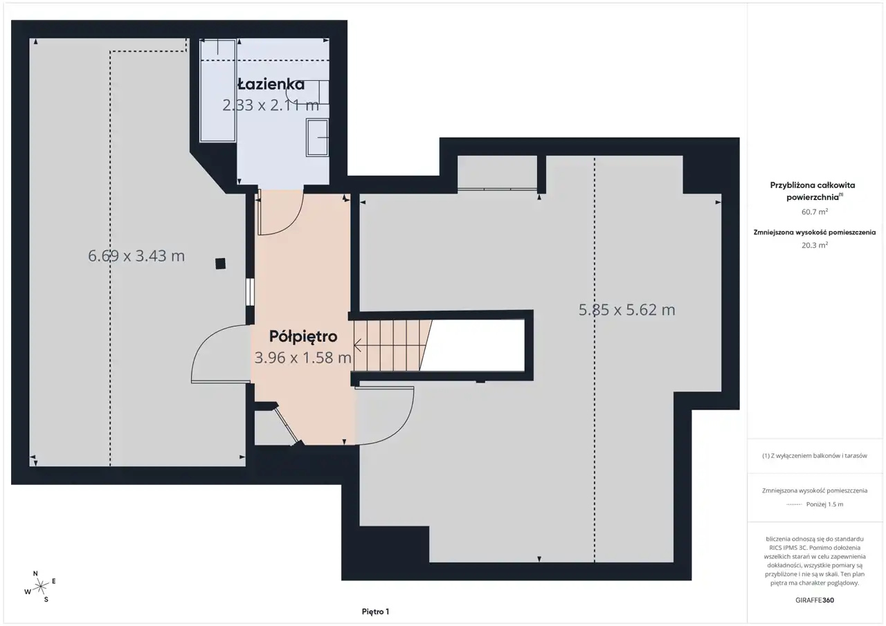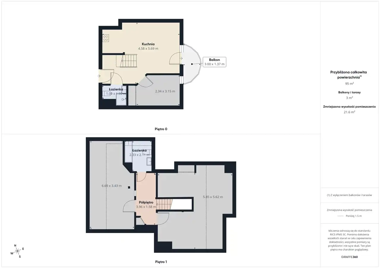 - Powierzchnia po podłodze (ze skosami): 95 m²