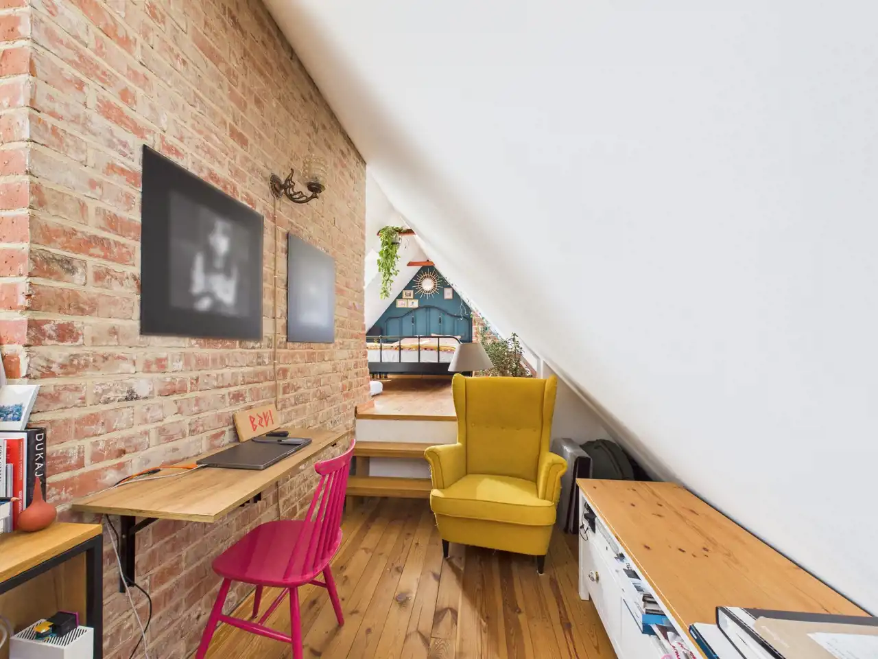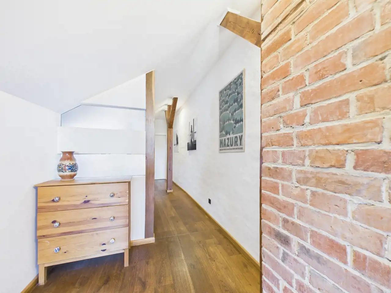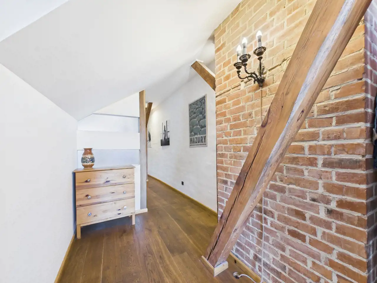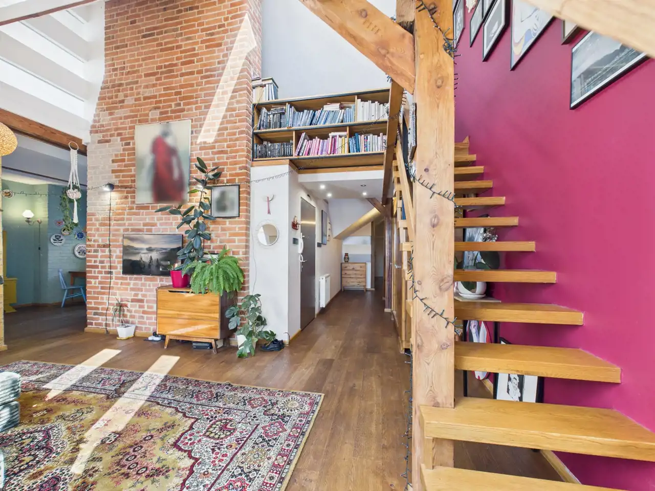 Ten unikalny apartament to przykład doskonałego połączenia współczesności z charakterem zabytkowej architektury. Położony w centrum miasta, zachwyca przemyślaną aranżacją, w której nowe materiały – stal i drewno – zostały umiejętnie zestawione z oryginalną cegłą oraz odsłoniętymi, drewnianymi belkami konstrukcyjnymi. Właściciel zadbał o spójność estetyczną i funkcjonalność – nowoczesne materiały nie dominują, lecz subtelnie współgrają z oryginalnymi elementami, tworząc harmonijną całość.