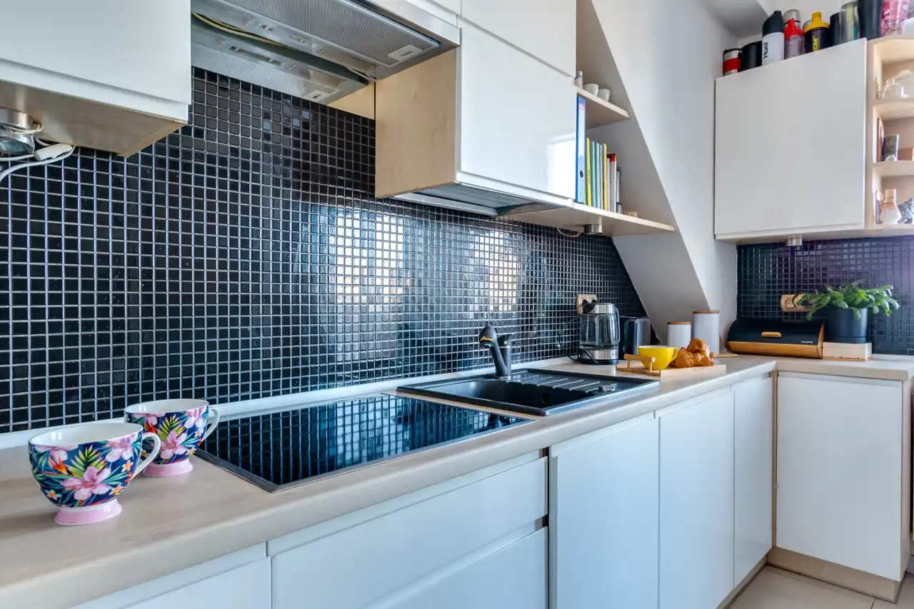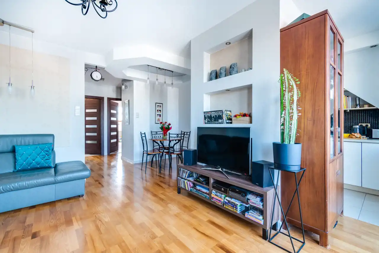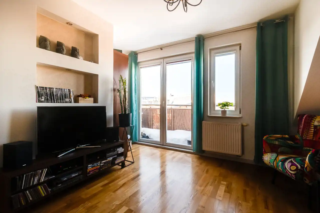 przestronny, słoneczny salon z kuchnią oraz wyjściem na duży balkon