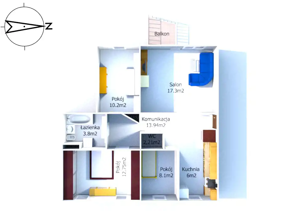 - 3 pokoje o powierzchniach 8.1m2, 10.2m2 oraz 12.75m2