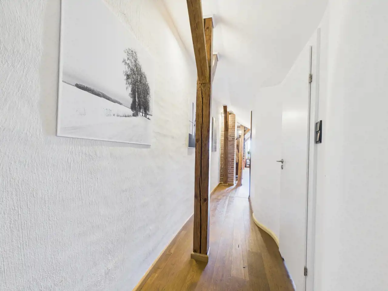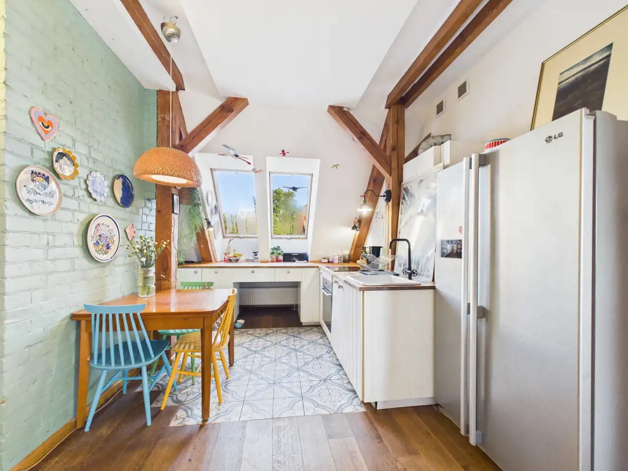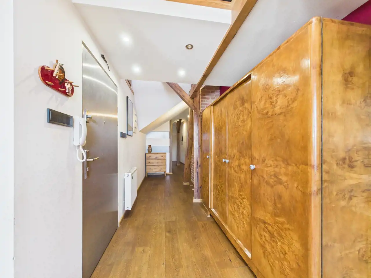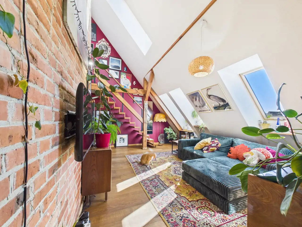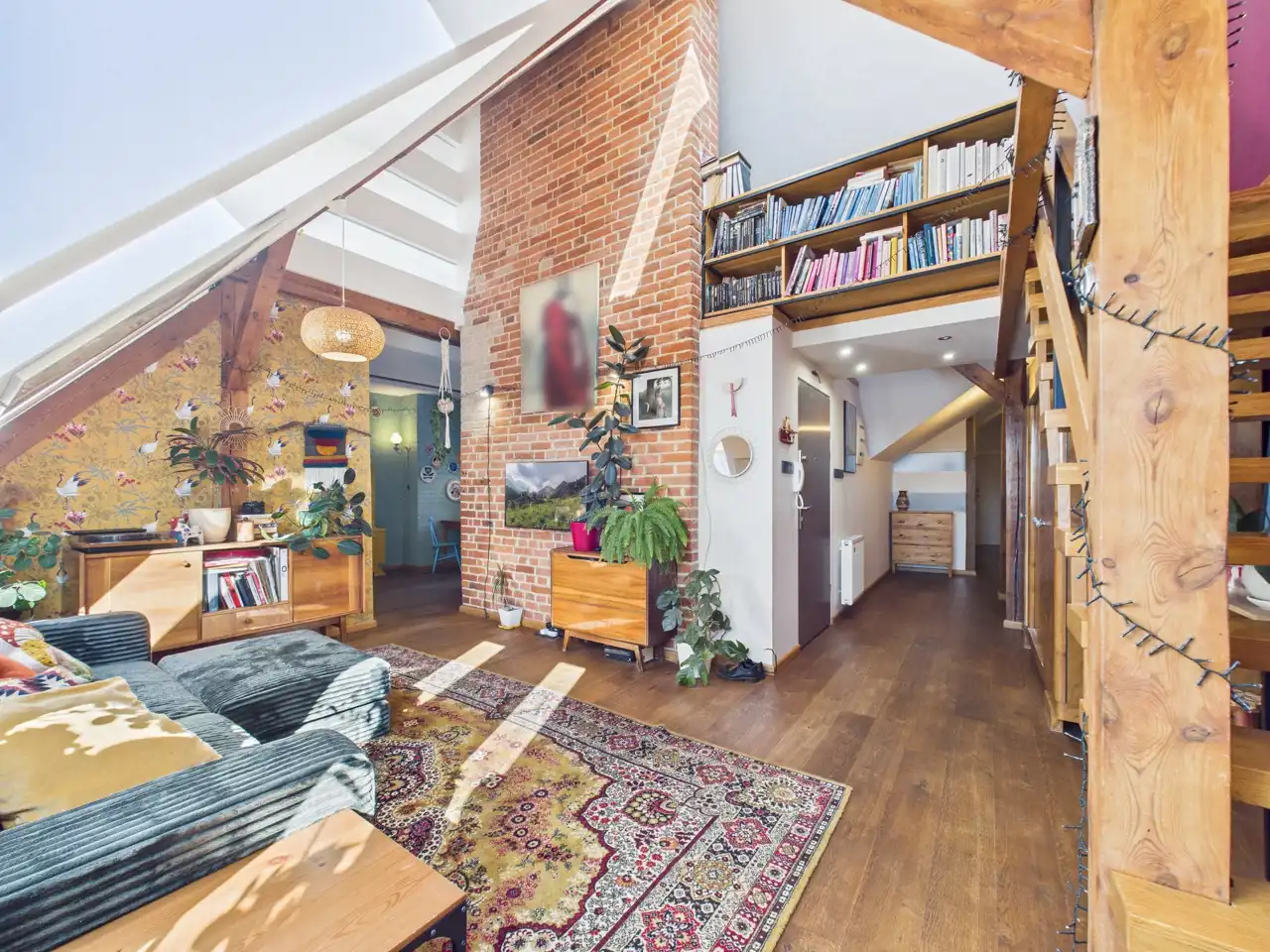 Ten unikalny apartament to przykład doskonałego połączenia współczesności z charakterem zabytkowej architektury. Położony w centrum miasta, zachwyca przemyślaną aranżacją, w której nowe materiały – stal i drewno – zostały umiejętnie zestawione z oryginalną cegłą oraz odsłoniętymi, drewnianymi belkami konstrukcyjnymi. Właściciel zadbał o spójność estetyczną i funkcjonalność – nowoczesne materiały nie dominują, lecz subtelnie współgrają z oryginalnymi elementami, tworząc harmonijną całość.