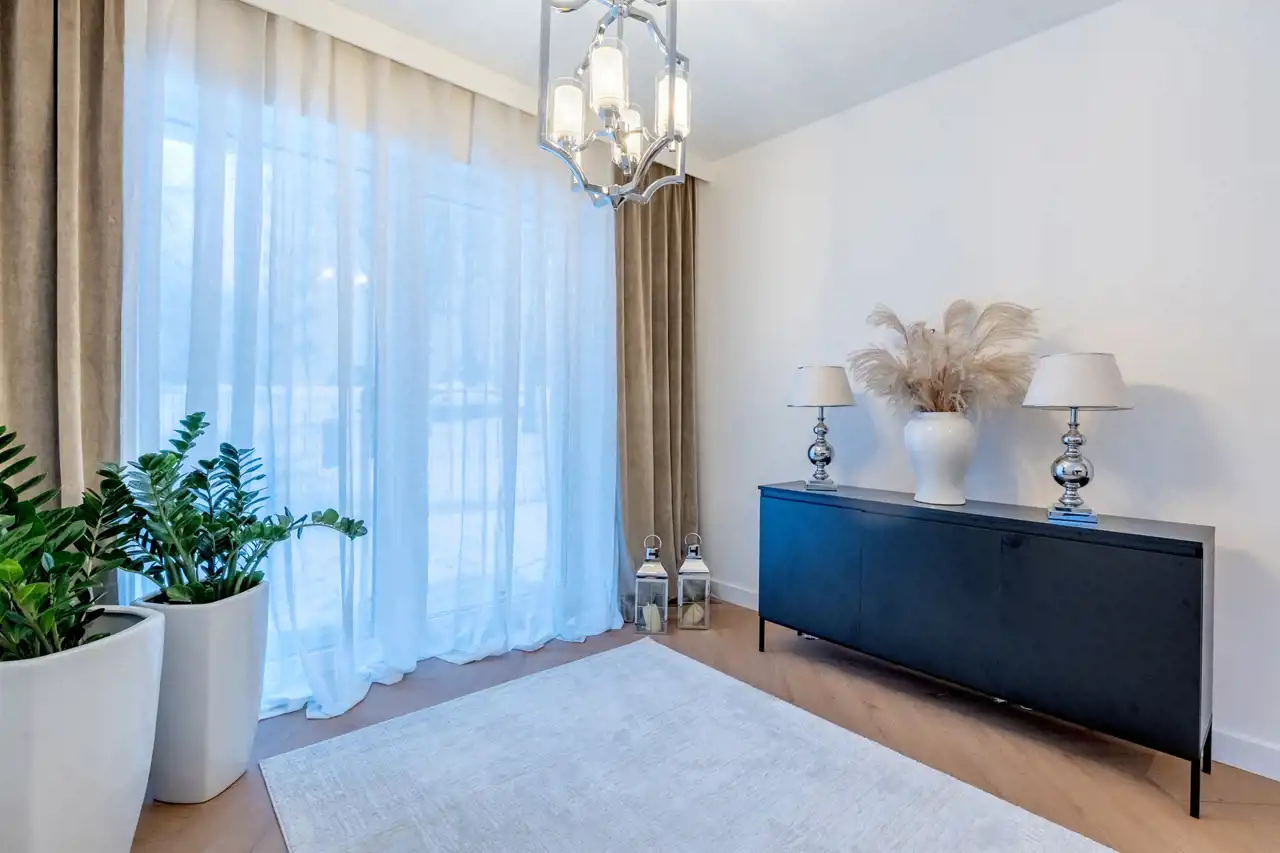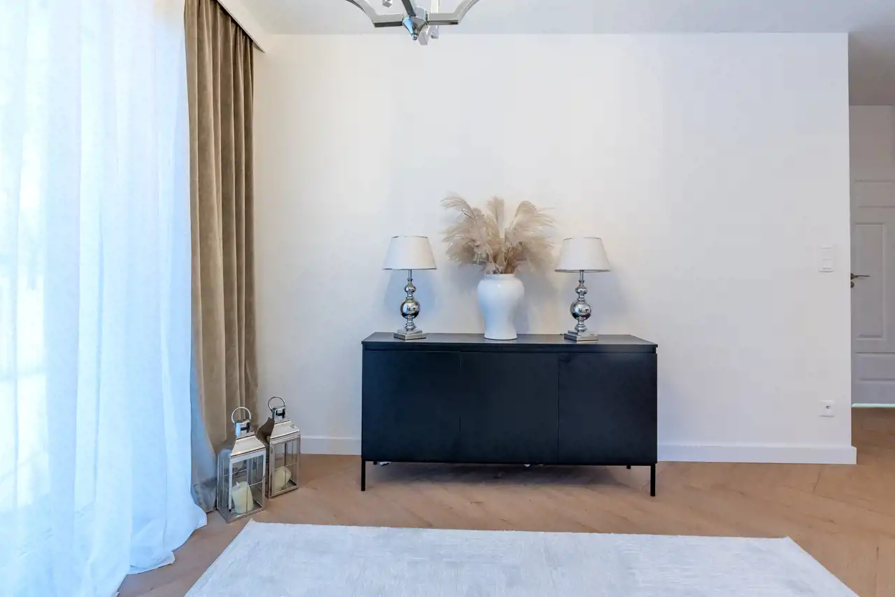Całość dopełnia efektowne, wysokiej klasy oświetlenie, karnisze oraz firanki i zasłony szyte pod wymiar.