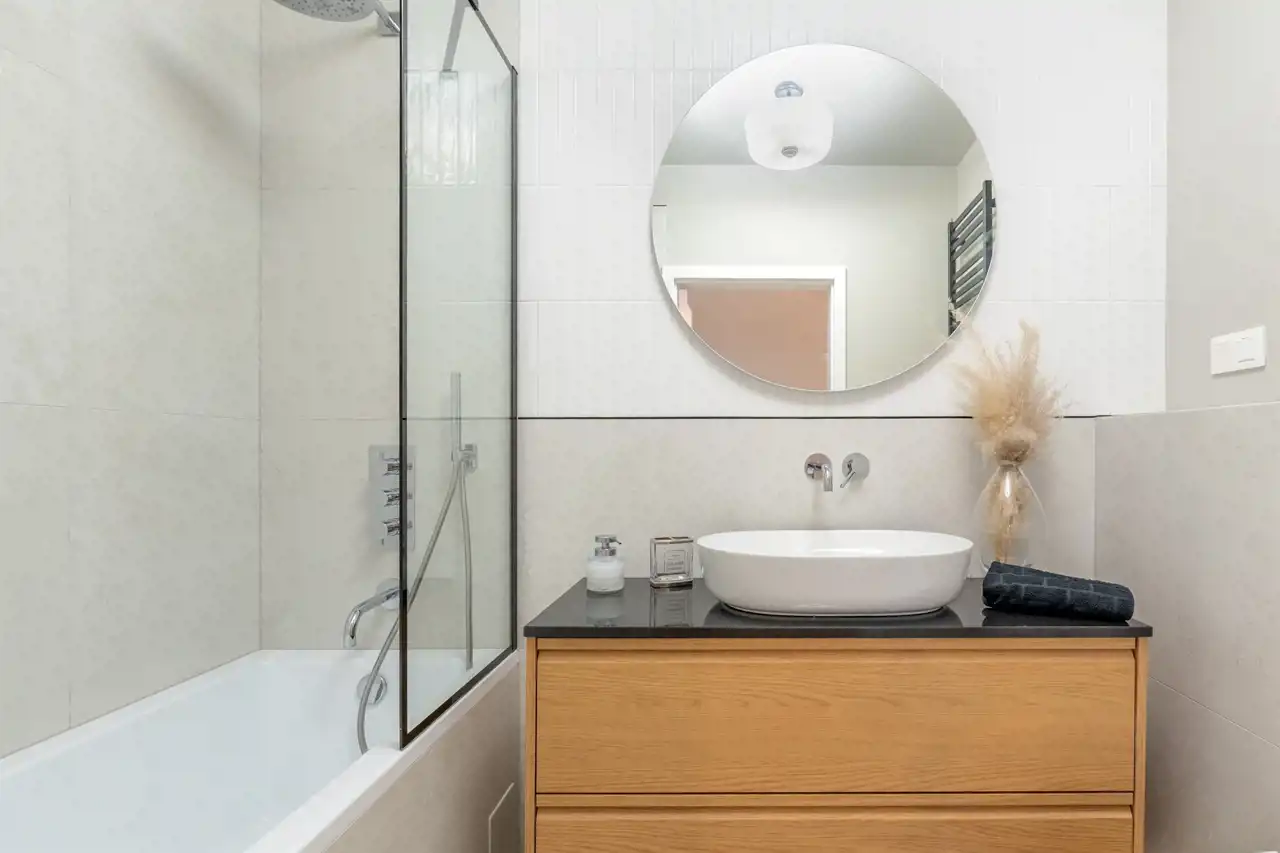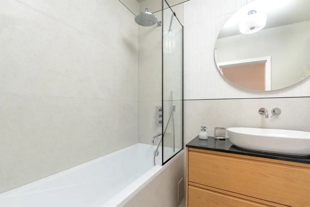 Na podłodze znajdują się sprowadzane na zamówienie wysokiej klasy panele winylowe i drewniane listwy przypodłogowe. Na podłodze w łazience gres szkliwiony, armatura renomowanej firmy ceramicznej, drewniana szafka pod umywalką i przepiękny MARMUROWY BLAT, nadający tej przestrzeni niepowtarzalnego klimatu i elegancji. Duża wanna z funkcją prysznica.
