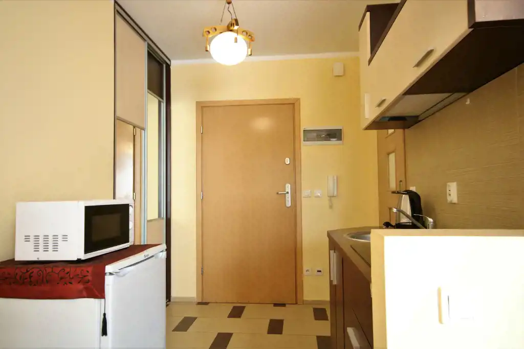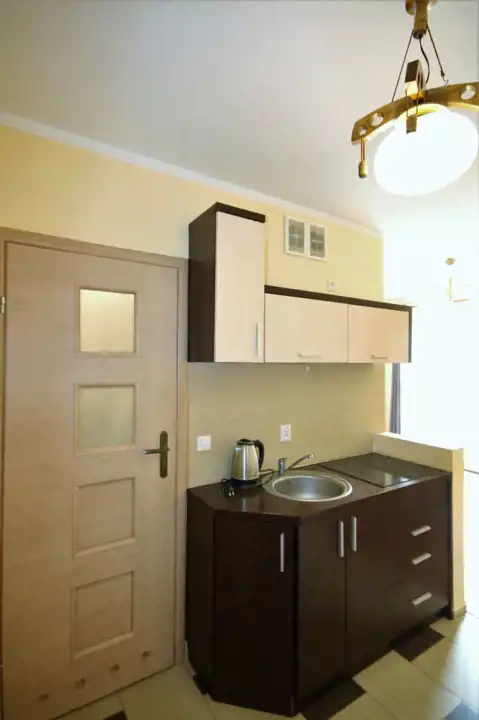 Urządzone w wysokim standardzie , składa się z salonu z wyjściem na balkon, aneksu kuchennego, łazienki z prysznicem , w przedpokoju zabudowana szafa.
