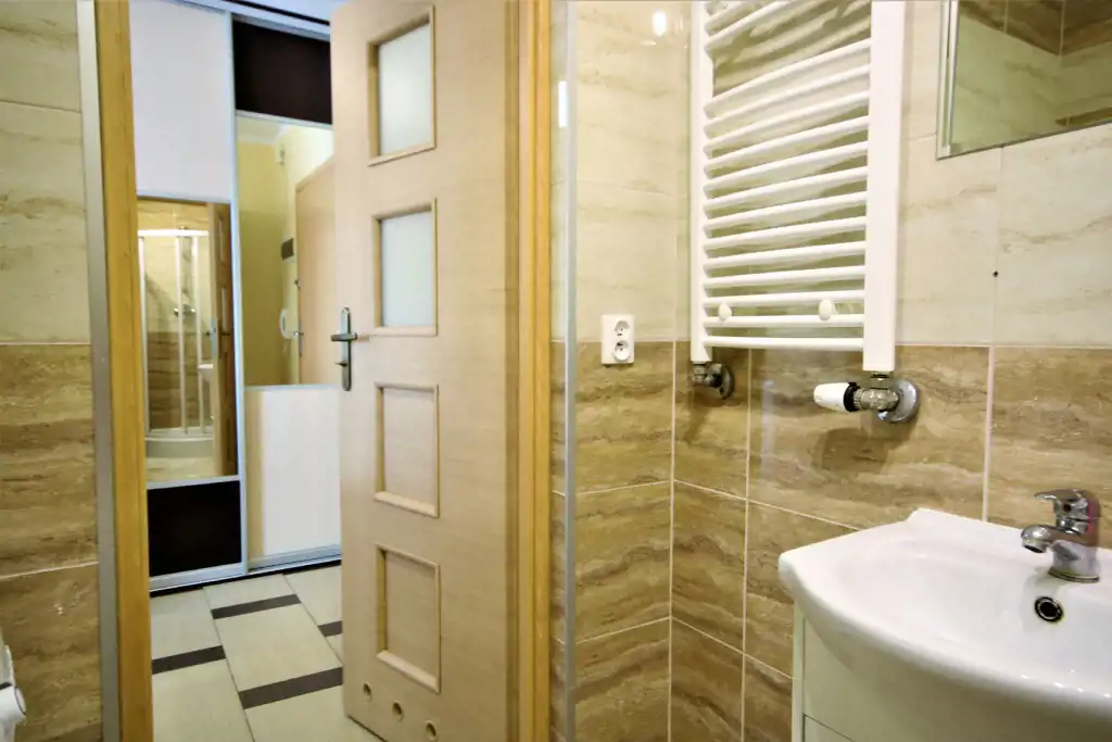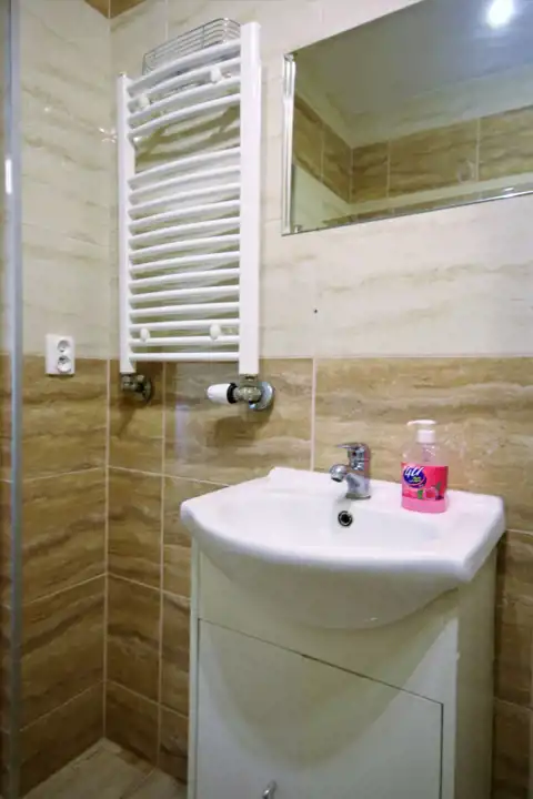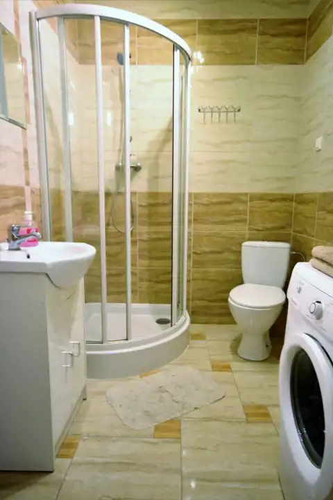 - w łazience pralka. Na wyposażeniu znajduje się również odkurzacz, deska do prasowania, suszarka do bielizny.