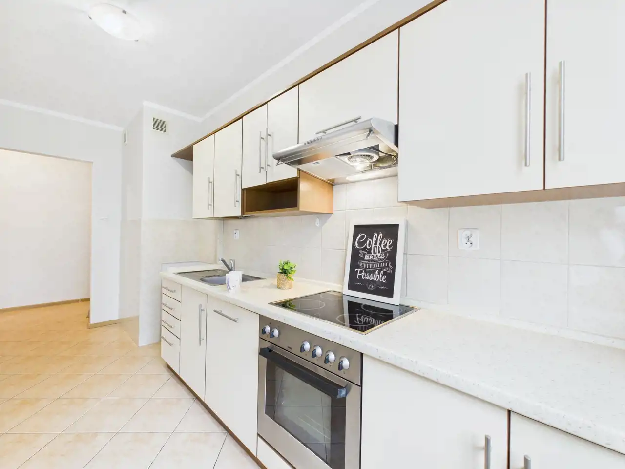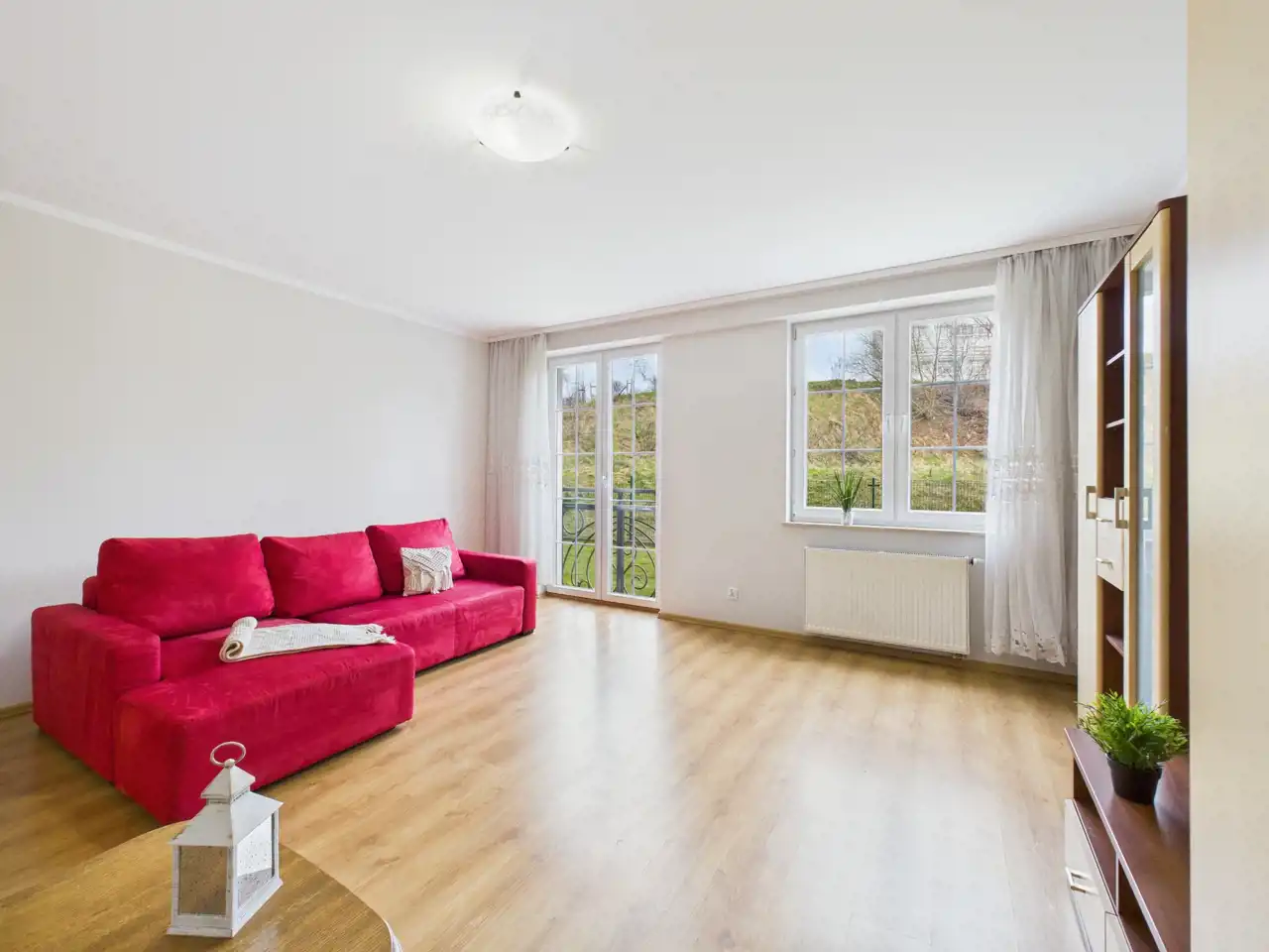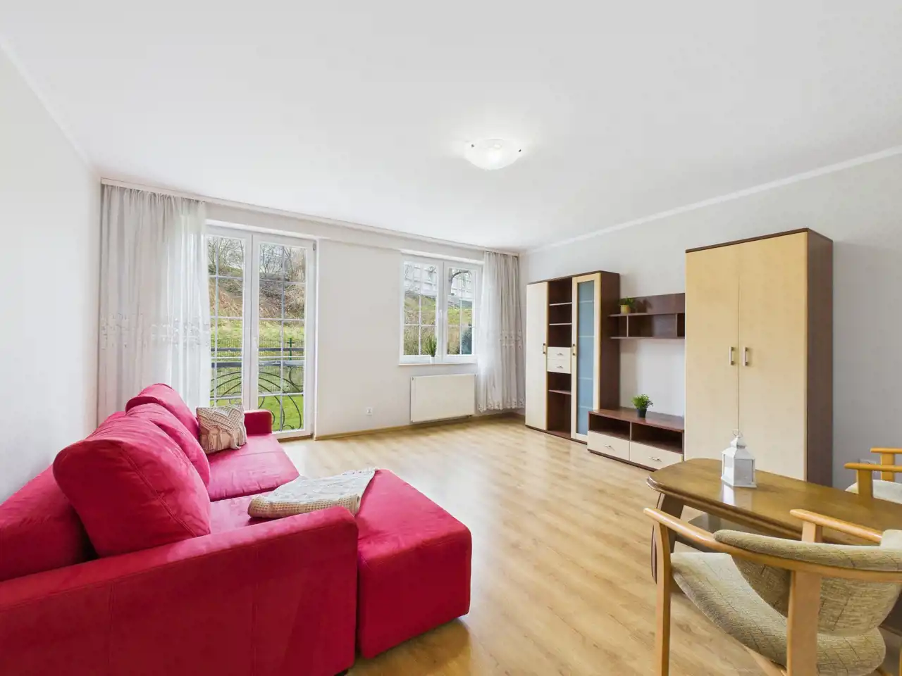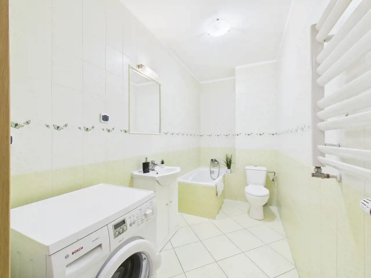 W salonie znajduje się kanapa rozkładana, segment, ława i 2 fotele. W kuchni znajduje się pełna zabudowa kuchenna z niezbędnymi sprzętami AGD. W łazience znajduje się wanna, pralka.