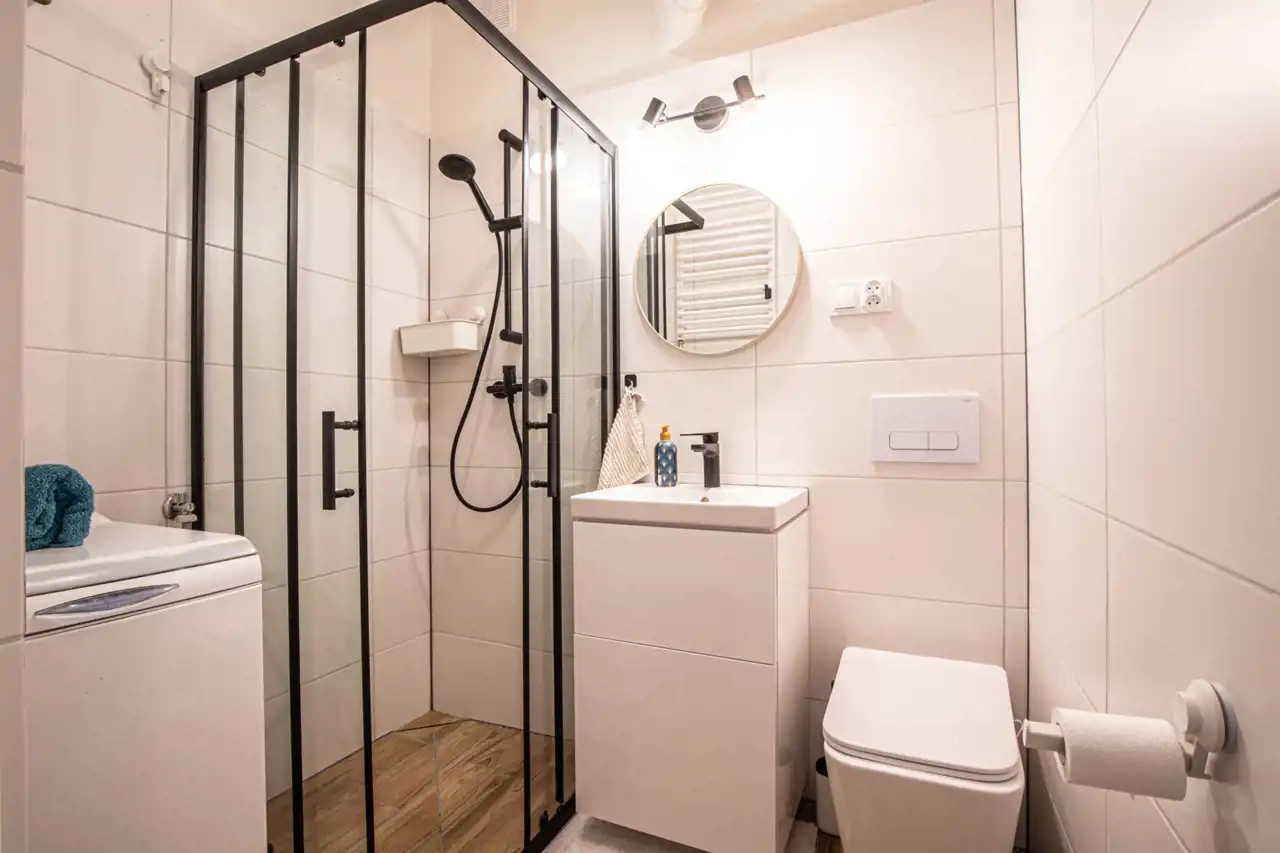 W pokojach na podłodze panele. Łazienka wyposażona jest w kabinę prysznicową, wykończona jest glazurą i terakotą w jasnych odcieniach.