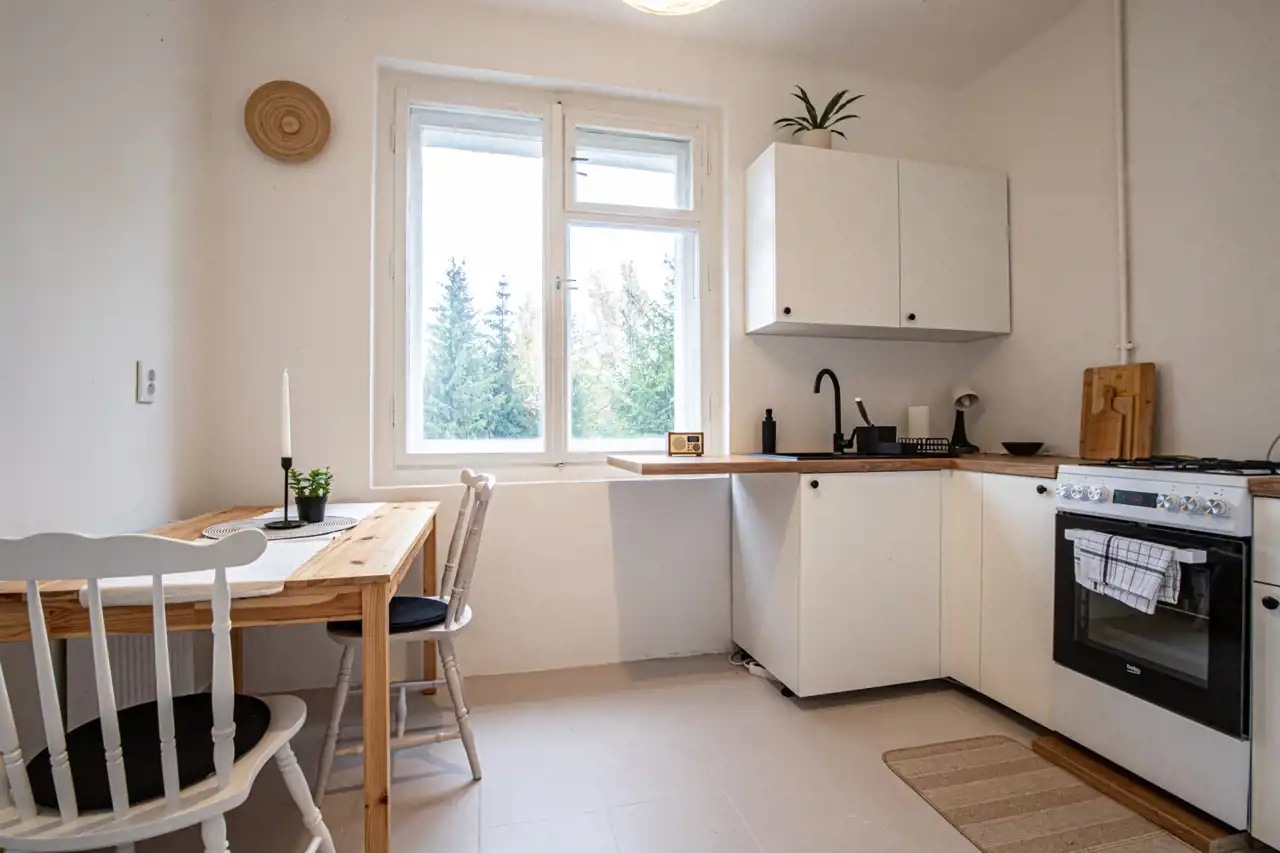 Kuchnia wyposażona jest w szafki, stół z taboretami, oraz niezbędne sprzęty AGD, w tym kuchenka gazowa z piekarnikiem i lodówko.