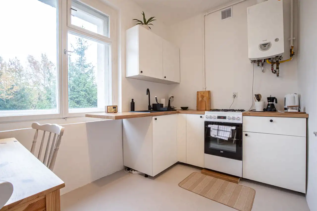 Ogrzewanie i ciepła woda z pieca gazowego dwufunkcyjnego, umieszczonego w kuchni.