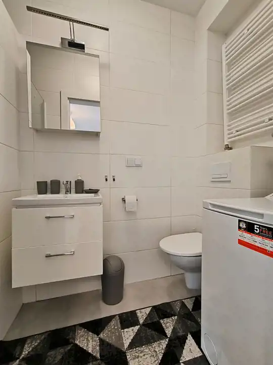 Wyposażenie mieszkania: ANEKS KUCHNNY: szafki kuchenne, płyta indukcyjna, lodówko-zamrażarka, zlewozmywak z baterią, czajnik, taborety, POKÓJ: kanapa z funkcją spania, stolik kawowy, szafa, komoda, ŁAZIENKA: kabina prysznicowa, wc, pralka, umywalka z szafką.
