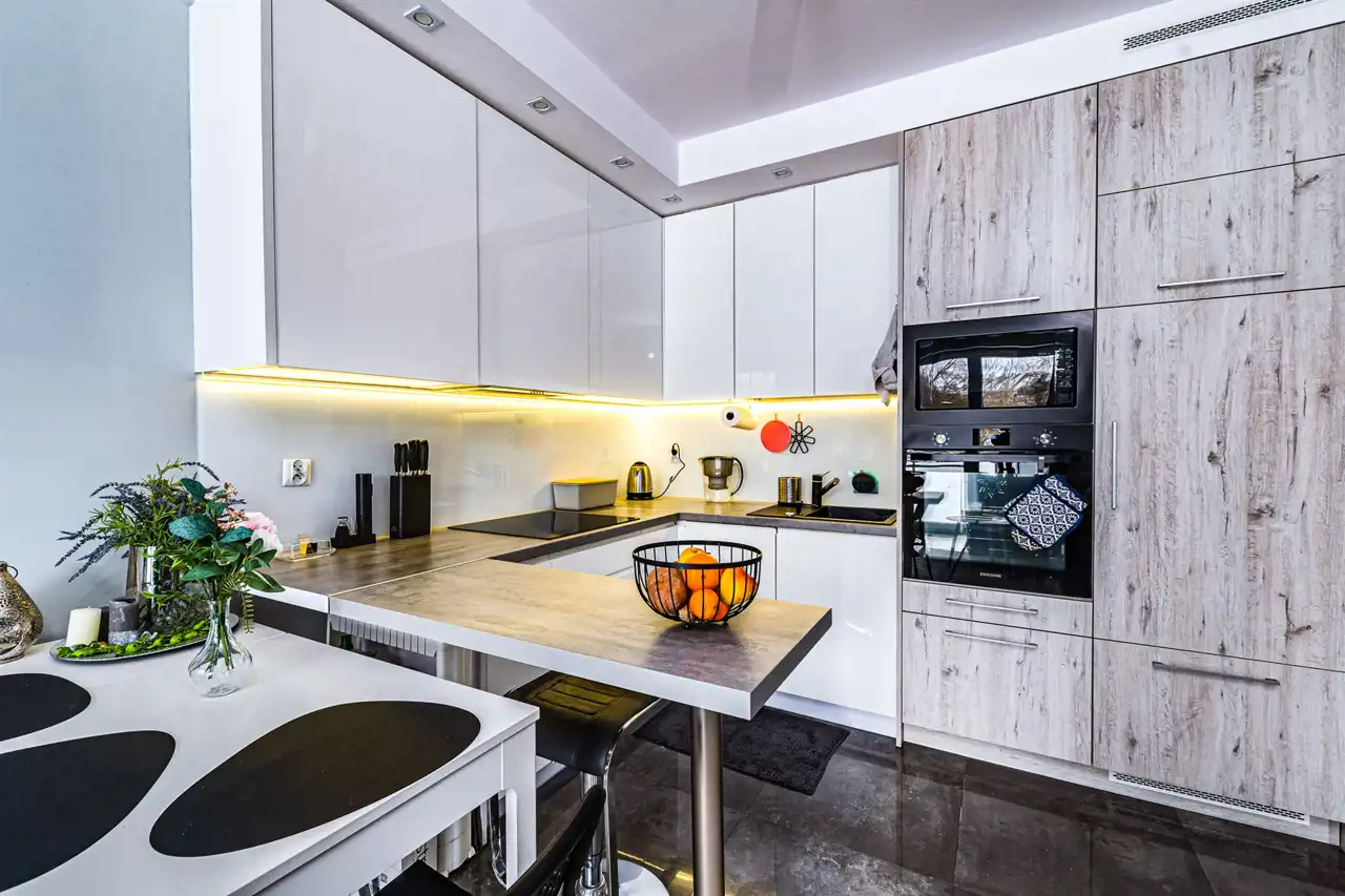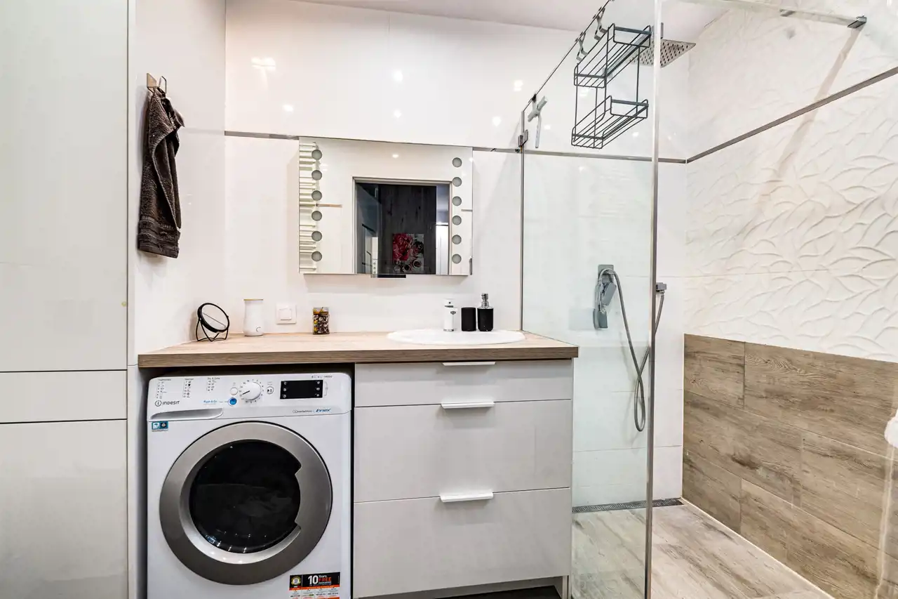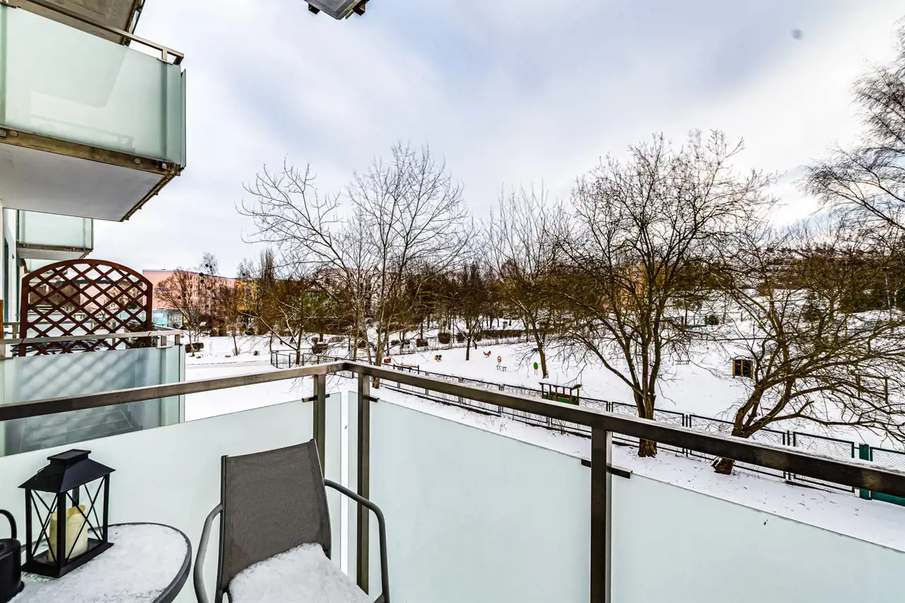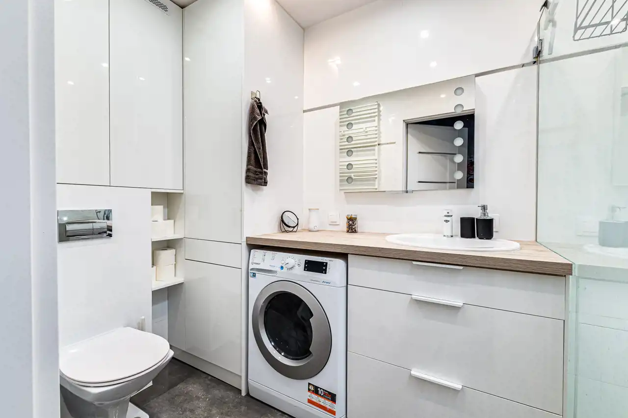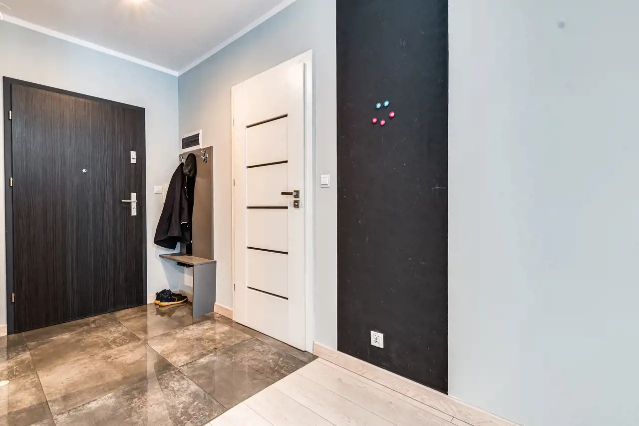W mieszkaniu zamontowane jest ogrzewanie podłogowe (dwa oddzielne sterowniki – przedpokój oraz salon). Kuchnia wyposażona jest we wszystkie nowoczesne sprzęty: zmywarkę, płytę indukcyjną, piekarnik oraz lodówkę. W łazience znajduje się nowoczesna pralkosuszarka. W cenie najmu zawarte są meble.