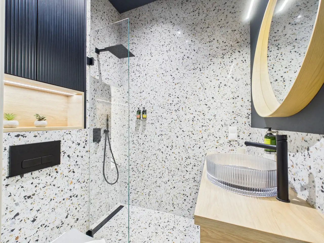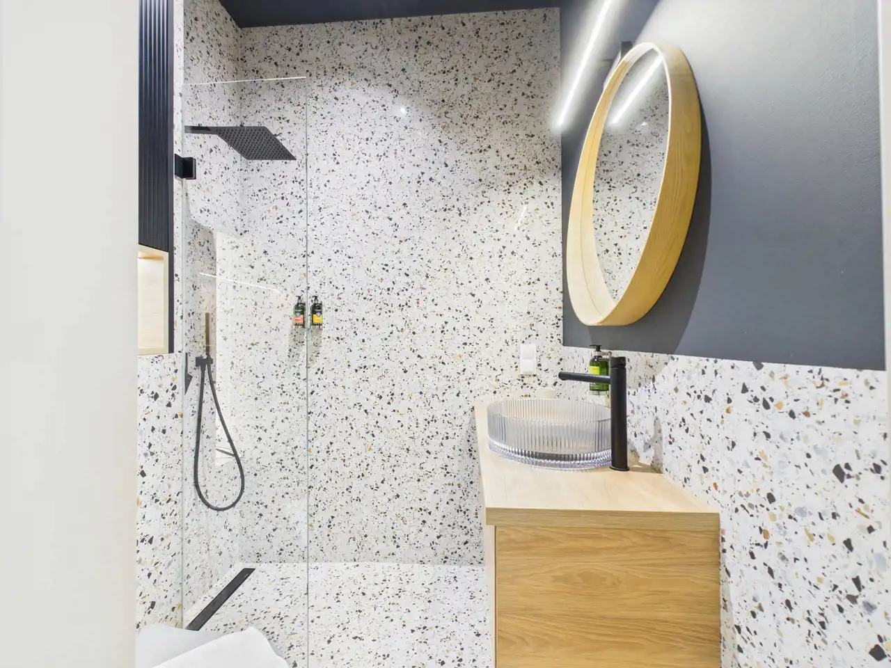 - łazienki z kabiną prysznicową walk-in, w nowoczesnym przyciągającym uwagę stylu.
