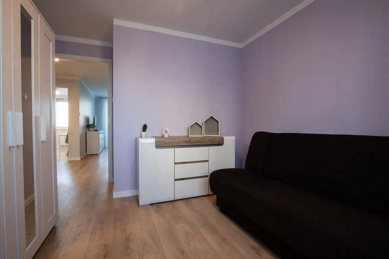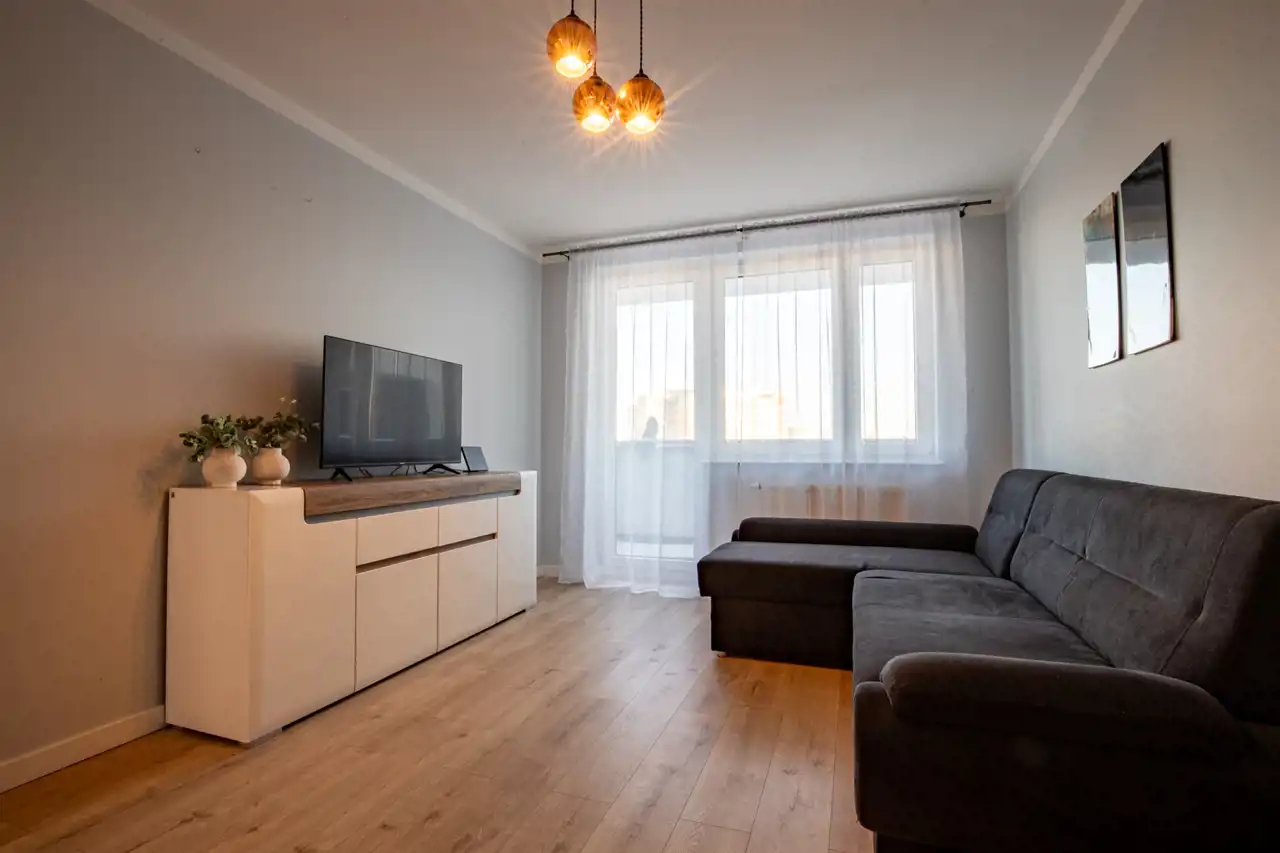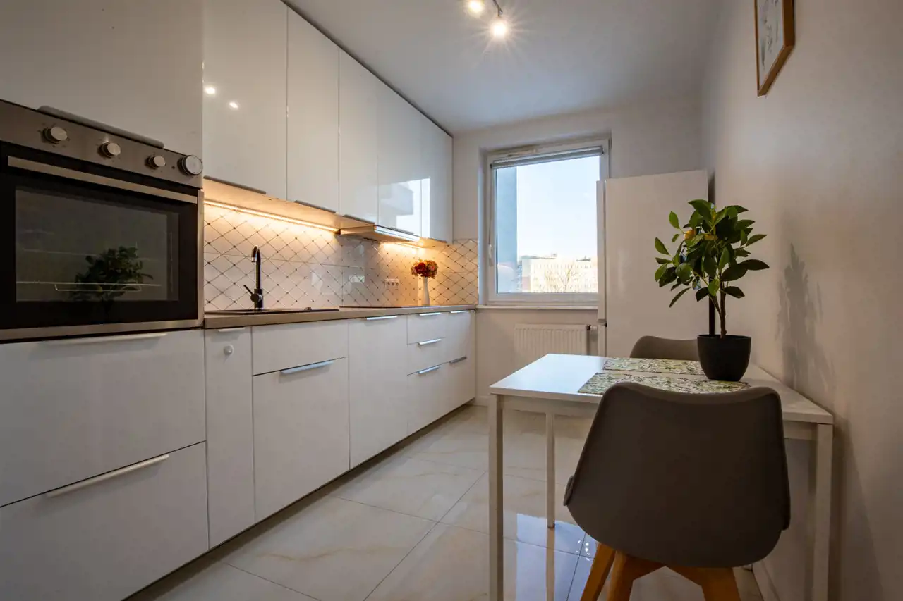 Mieszkanie jest w pełni wyposażone. Kuchnia ze sprzętem AGD: lodówko-zamrażarka, ekspres, płyta indukcyjna, piekarnik, mikrofalówka, okap, stół z krzesłami, kanapa, telewizor, szafki, półki. pralka.