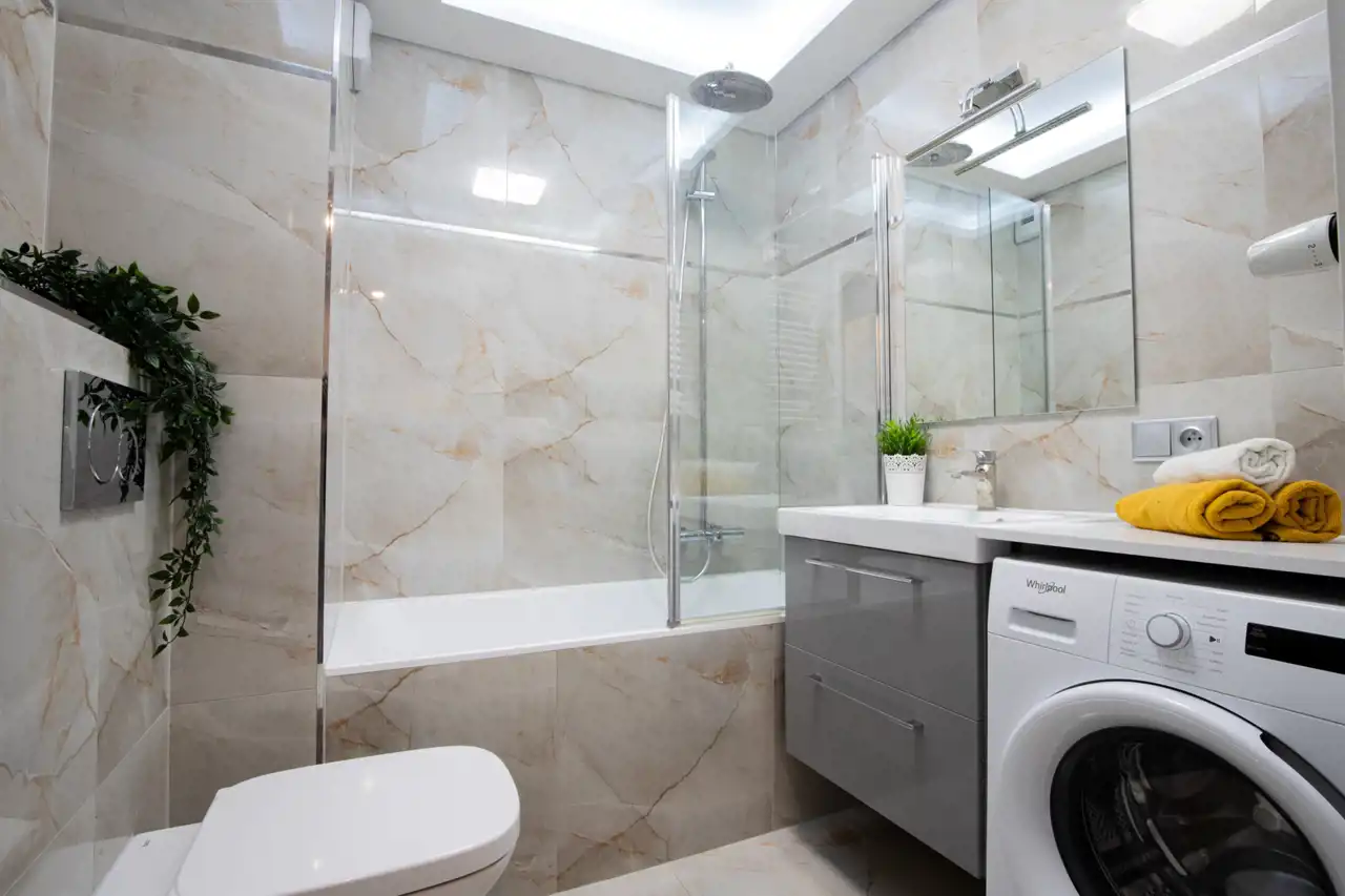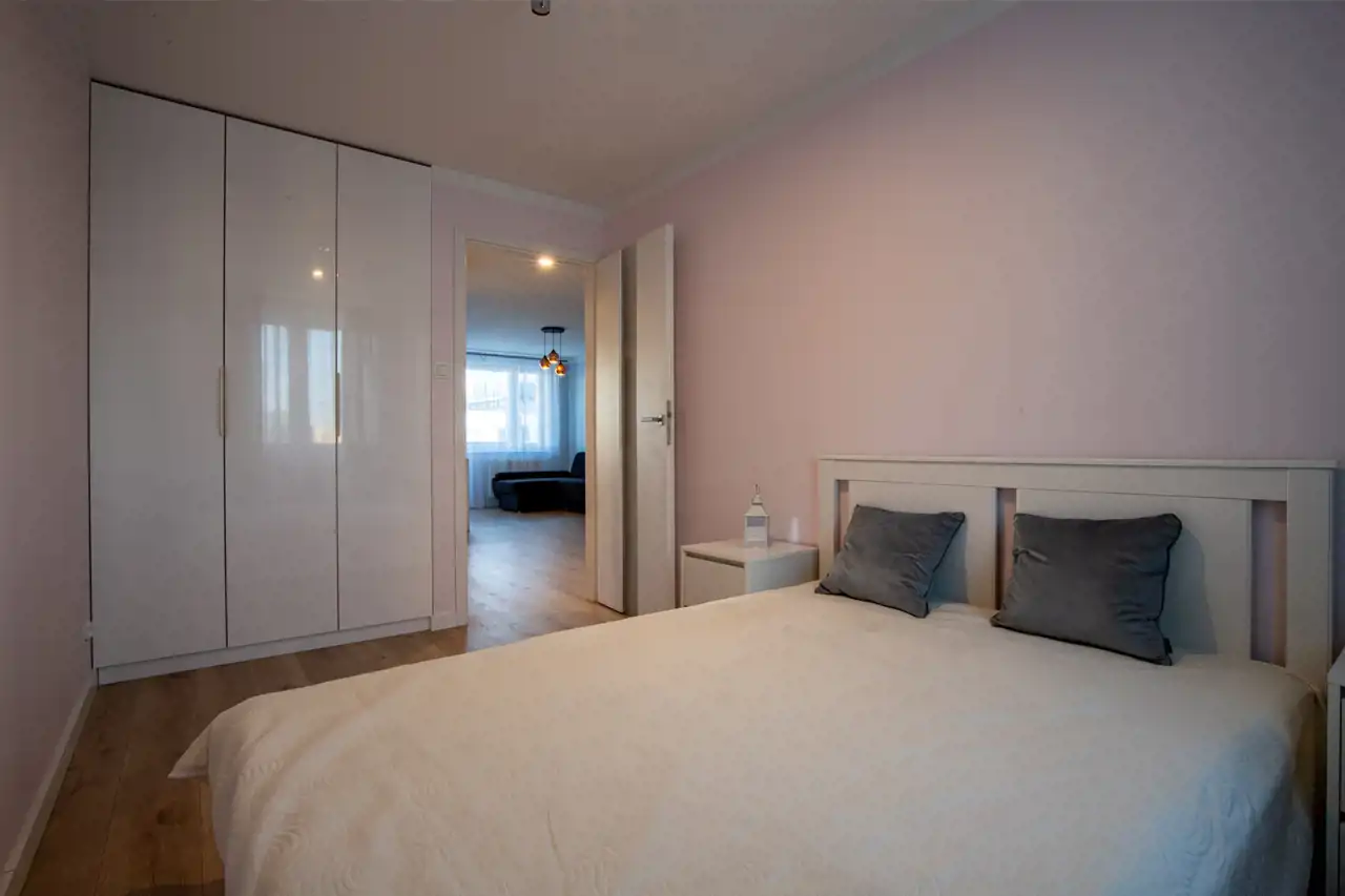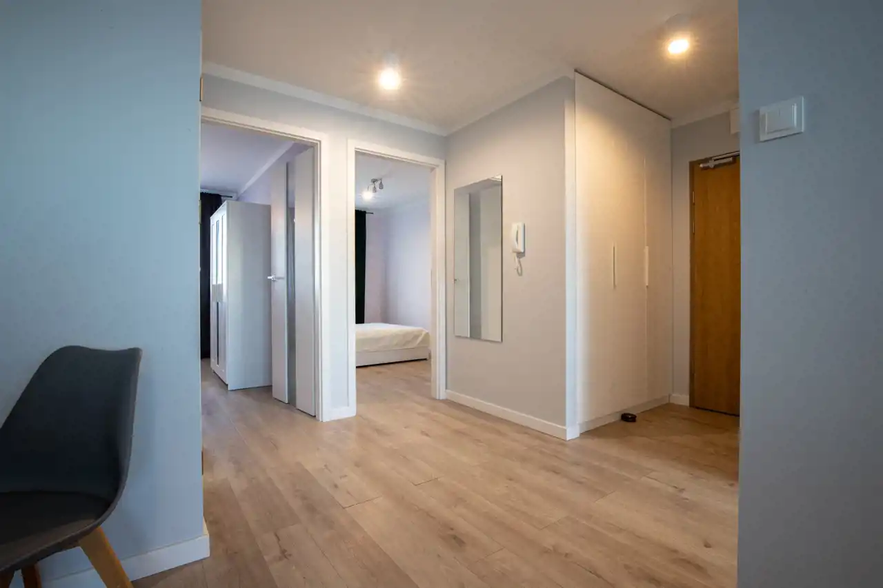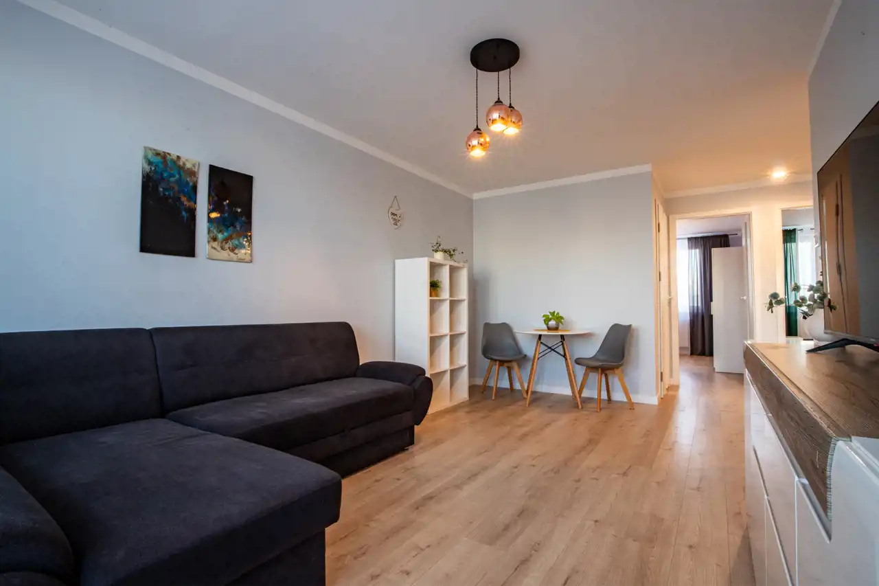 Mieszkanie jest w pełni wyposażone. Kuchnia ze sprzętem AGD: lodówko-zamrażarka, ekspres, płyta indukcyjna, piekarnik, mikrofalówka, okap, stół z krzesłami, kanapa, telewizor, szafki, półki. pralka.