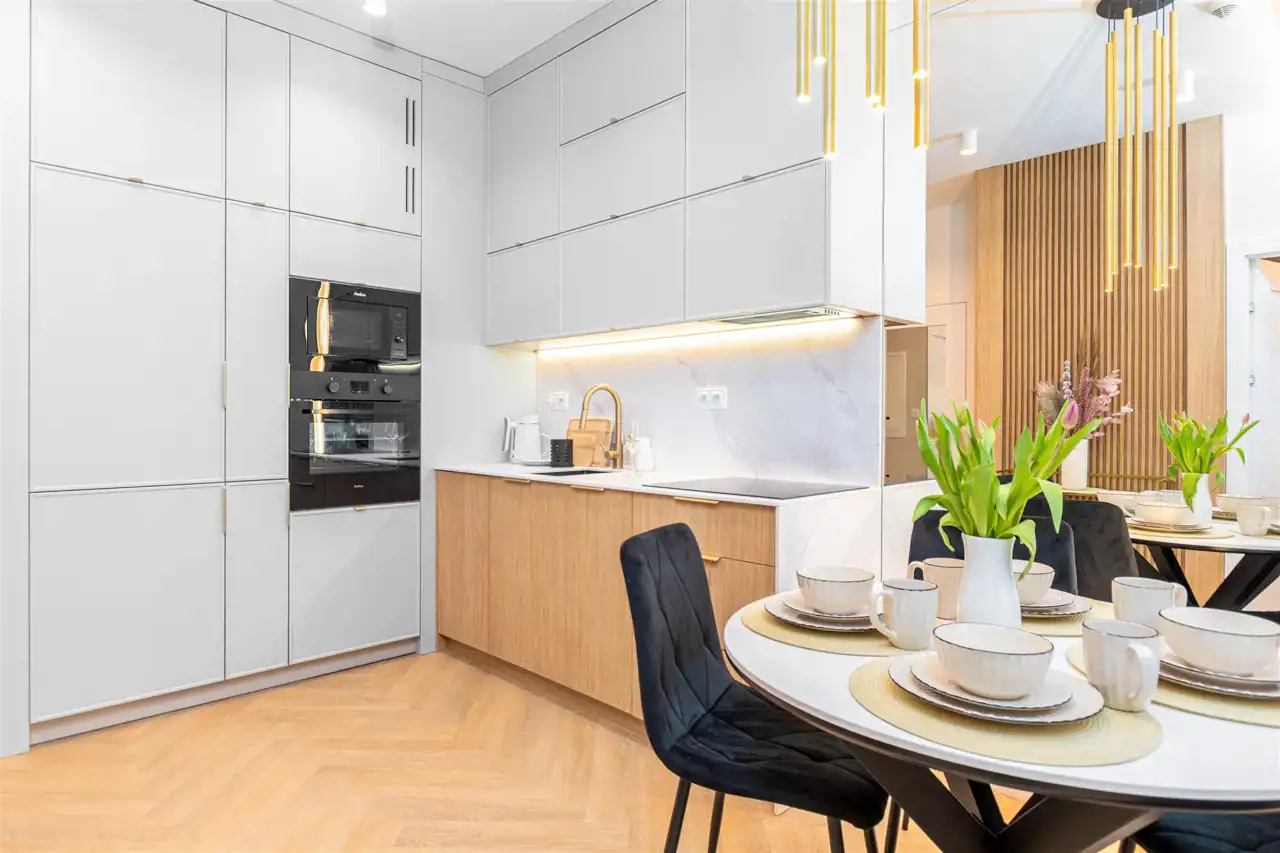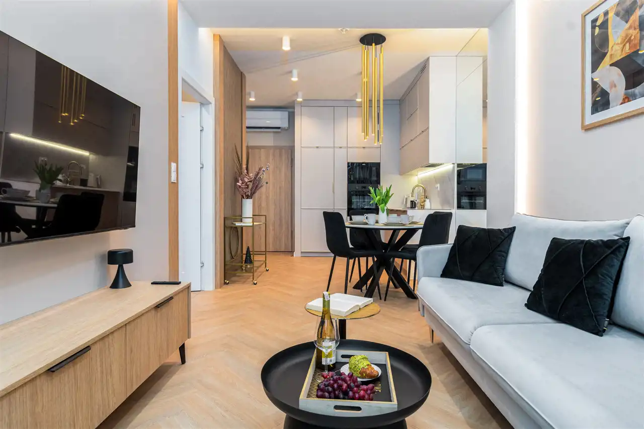 Pokoju dziennego połączonego z aneksem kuchennym, z którego jest wyjście na duży balkon.