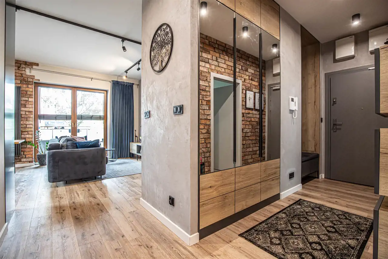 Przedpokój jest świetnie wykończony i wyposażony! Już od wejścia witają nas pakowne, stylowe i funkcjonalne szafy z lustrami oraz loftowe oświetlenie w kolorze czerni! Jedna ze ścian wyłożona została cegłą.