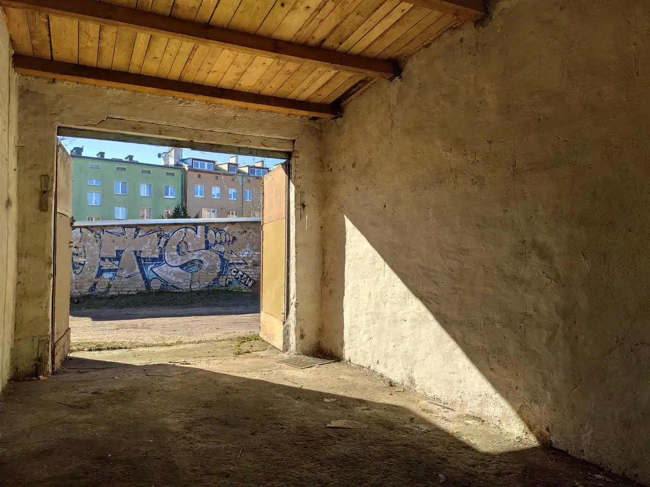 Nieruchomość znajduje się w podwórku z drogą dojazdową, nie posiada podłączenia do prądu ani wody.