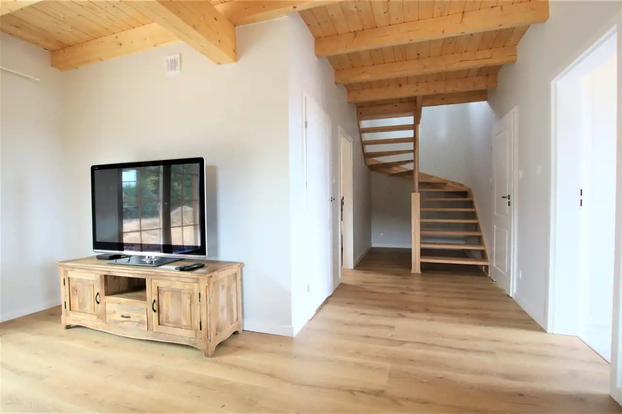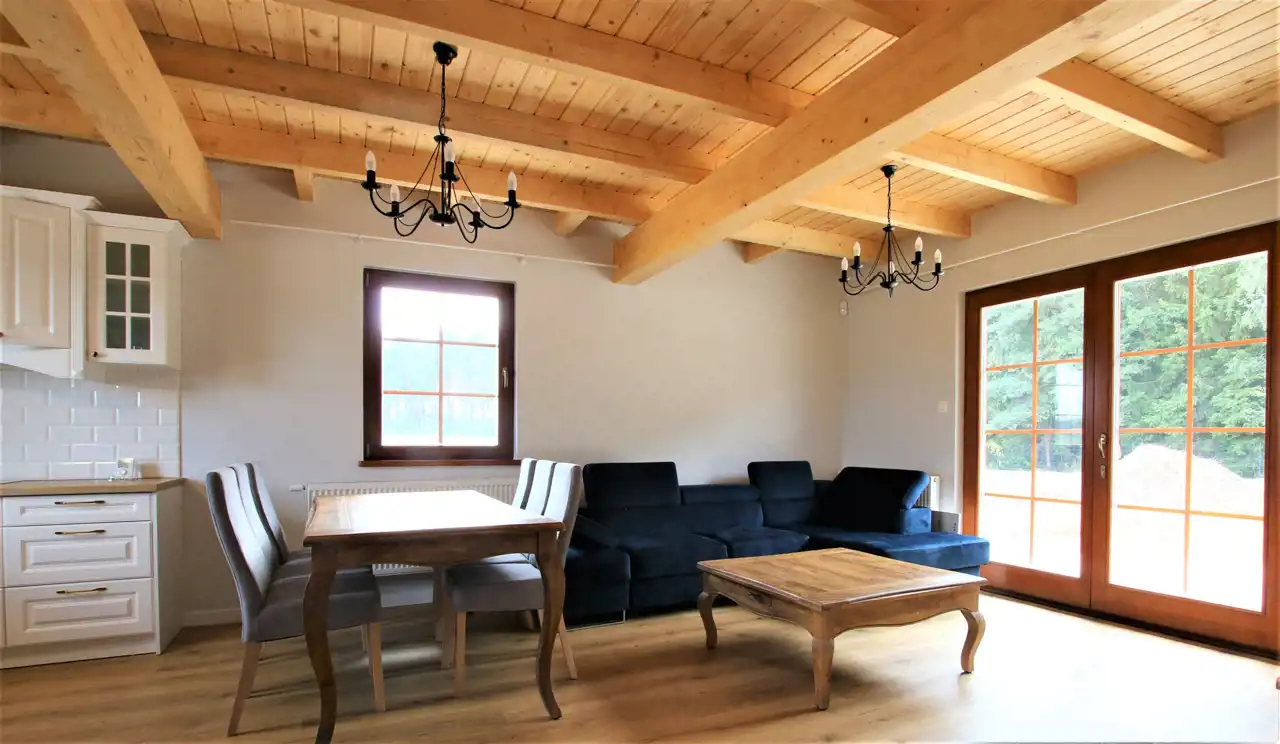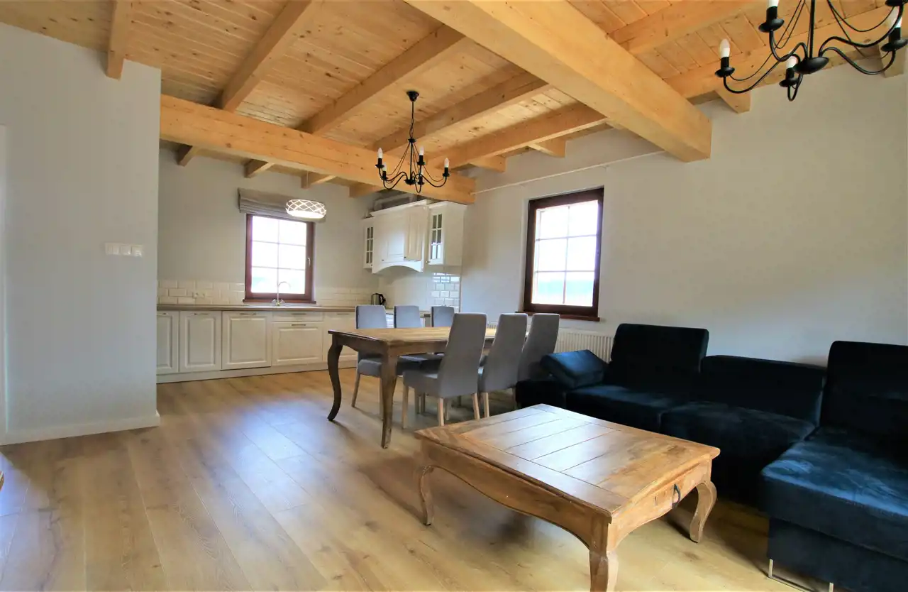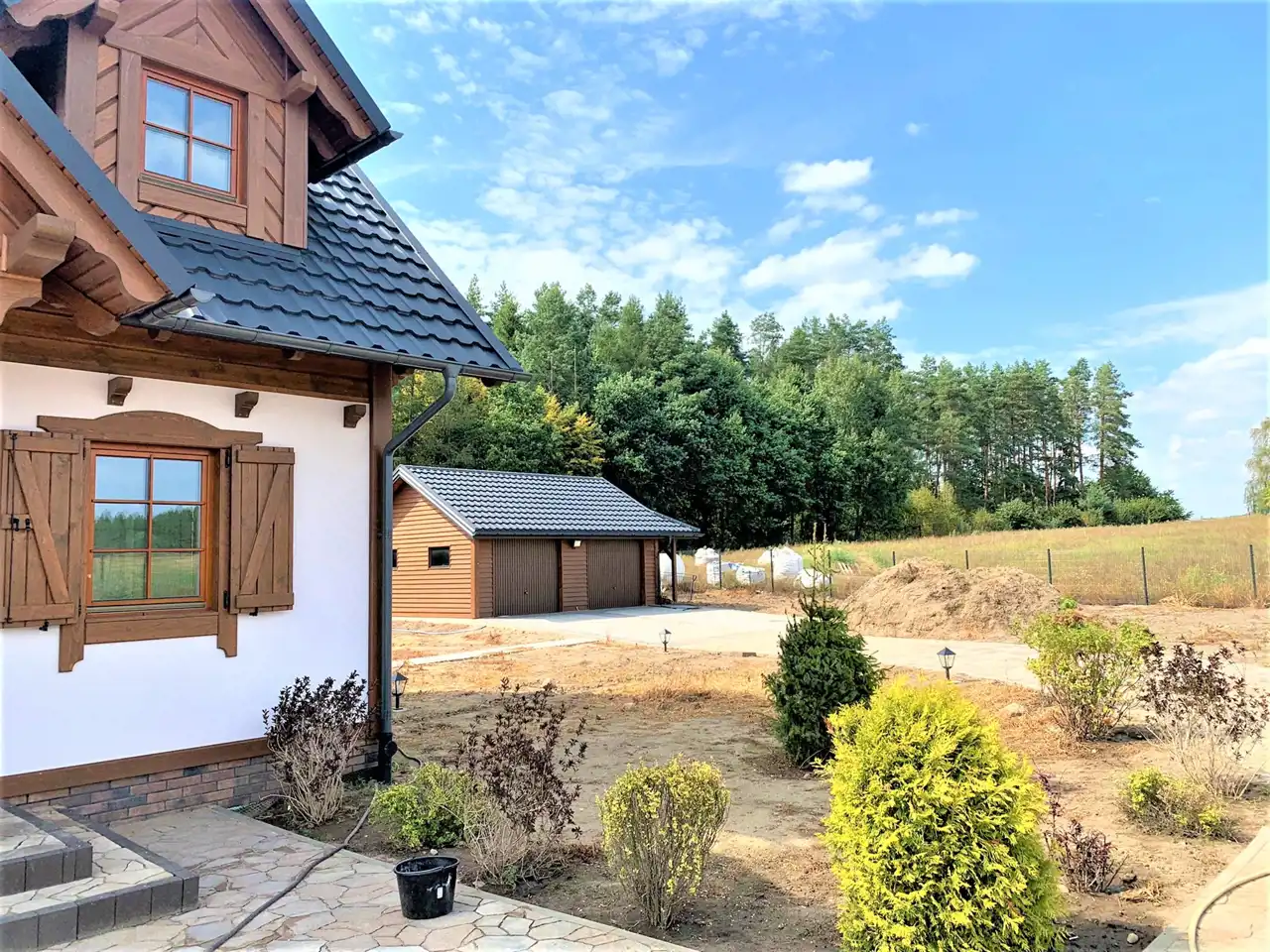 Dom w stylu rustykalnym, kryty dachówką ceramiczną. Na parterze: salon - jadalnia z kominkiem, wyjściem na taras i aneksem kuchennym; sypialnia/gabinet i łazienka. Na piętrze: trzy sypialnie (dwie z wyjściem na balkon) i łazienka. Ogrzewanie + woda użytkowa z kotła gazowego (zbiornik gazu na zewnątrz). Woda własna, ze studni. Prąd z sieci, Kanalizacja - szambo. Dom wzniesiony w konstrukcji szkieletowej, ekologiczny i oszczędny (wysoka izolacyjność ścian). Na działce brukowane podjazdy i dekoracyjne nasadzenia. Trawnik zostanie założony przed sprzedażą domu. W okolicy lasy, kilkanaście jezior, szlaki kajakowe, piesze i rowerowe. Powietrze krystalicznie czyste. Do Warszawy 180 km. Do Olsztyna 40 km.