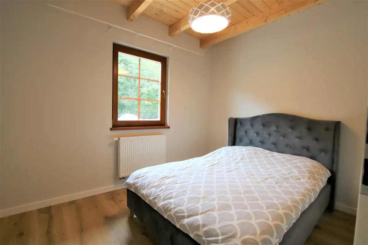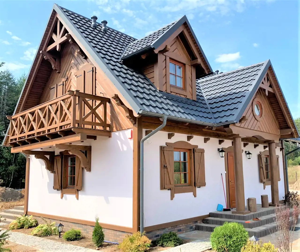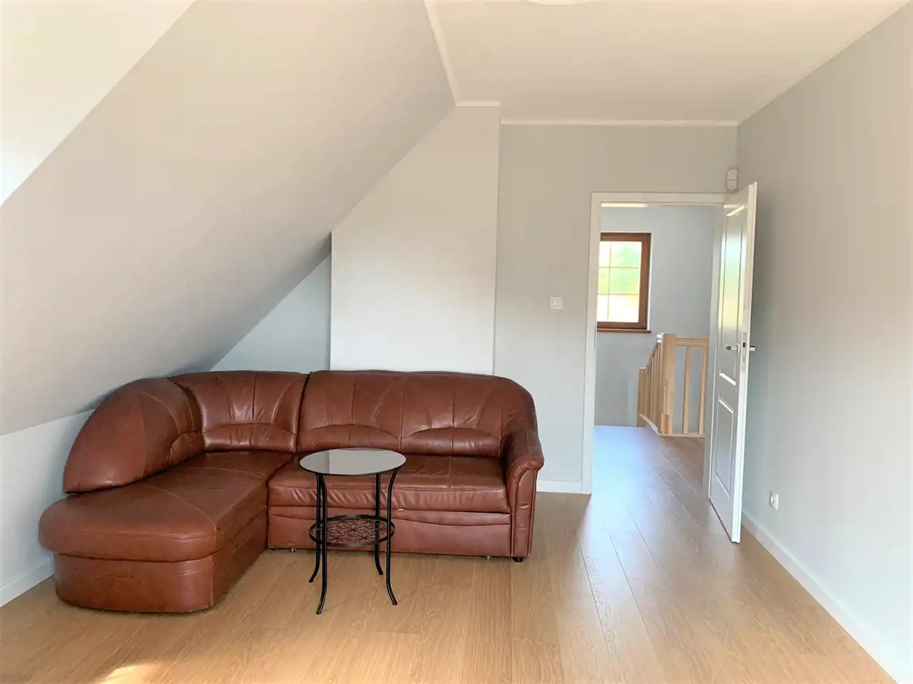 Dom w stylu rustykalnym, kryty dachówką ceramiczną. Na parterze: salon - jadalnia z kominkiem, wyjściem na taras i aneksem kuchennym; sypialnia/gabinet i łazienka. Na piętrze: trzy sypialnie (dwie z wyjściem na balkon) i łazienka. Ogrzewanie + woda użytkowa z kotła gazowego (zbiornik gazu na zewnątrz). Woda własna, ze studni. Prąd z sieci, Kanalizacja - szambo. Dom wzniesiony w konstrukcji szkieletowej, ekologiczny i oszczędny (wysoka izolacyjność ścian). Na działce brukowane podjazdy i dekoracyjne nasadzenia. Trawnik zostanie założony przed sprzedażą domu. W okolicy lasy, kilkanaście jezior, szlaki kajakowe, piesze i rowerowe. Powietrze krystalicznie czyste. Do Warszawy 180 km. Do Olsztyna 40 km.