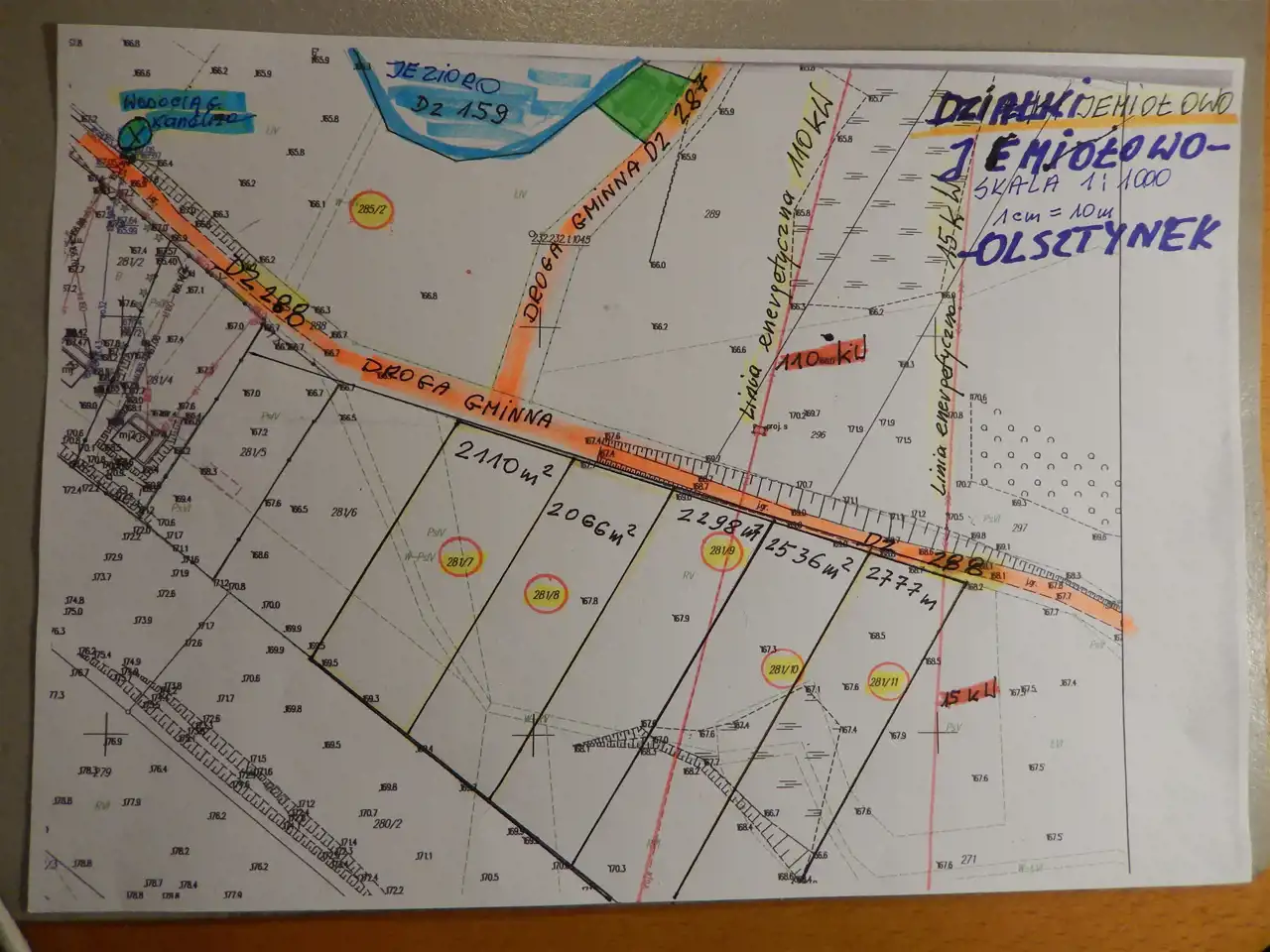 Olsztynek -Jemiołowo. Na sprzedaż 5 działek rekreacyjnych, mieszkaniowo - usługowych, od numeru ewidencyjnego 281/7 do numeru 281/11, w Jemiołowie w pobliżu Jeziora Jemiołowo. Działki, prostokąty o powierzchni : od 2066 m2 do 2777 m2, graniczące z gminną drogą żwirową, działka nr nr 288 równoległą z brzegiem jeziora. Szerokość działek od 24 do 30 m, długość od 70 m do 110 m.