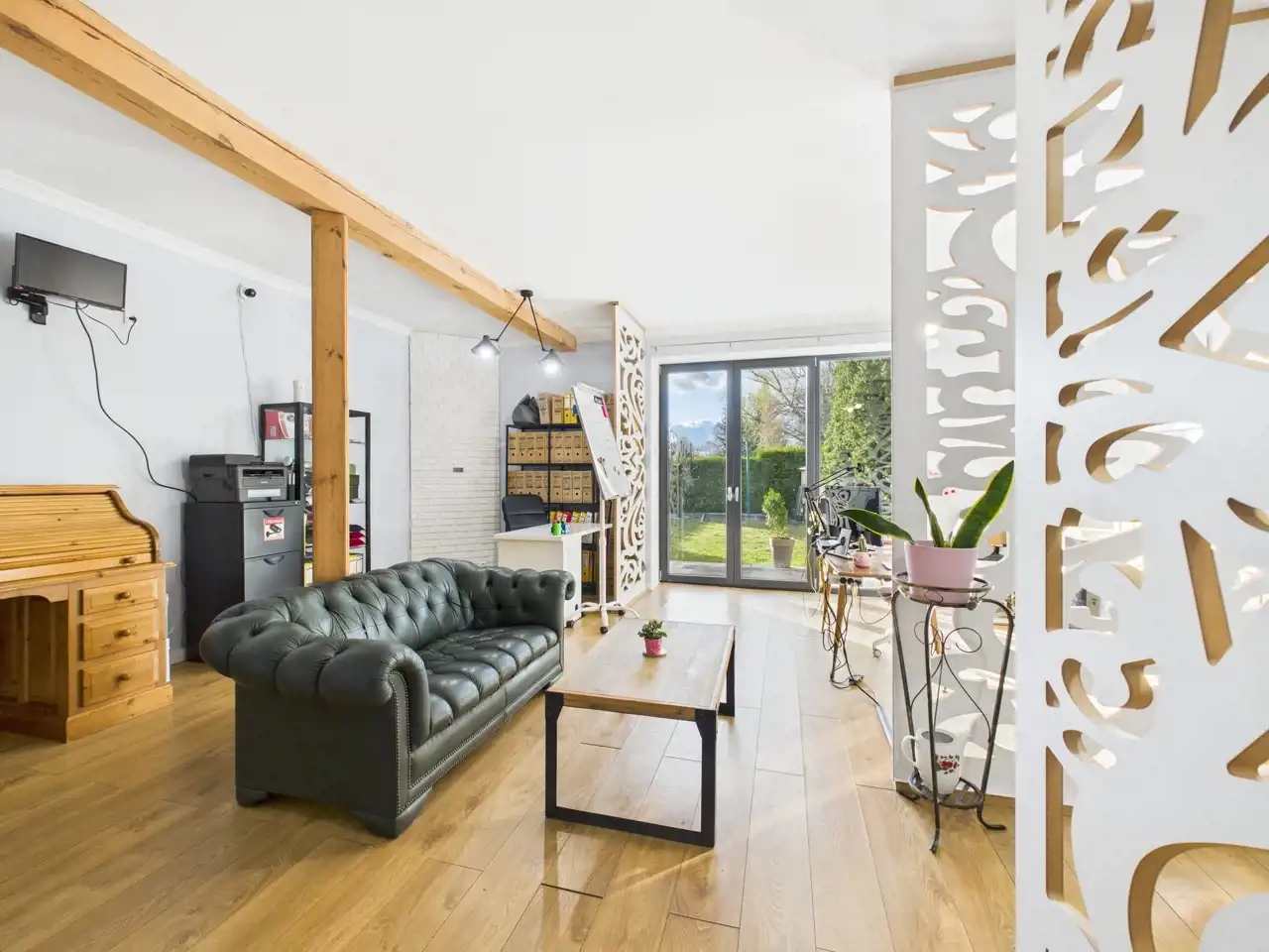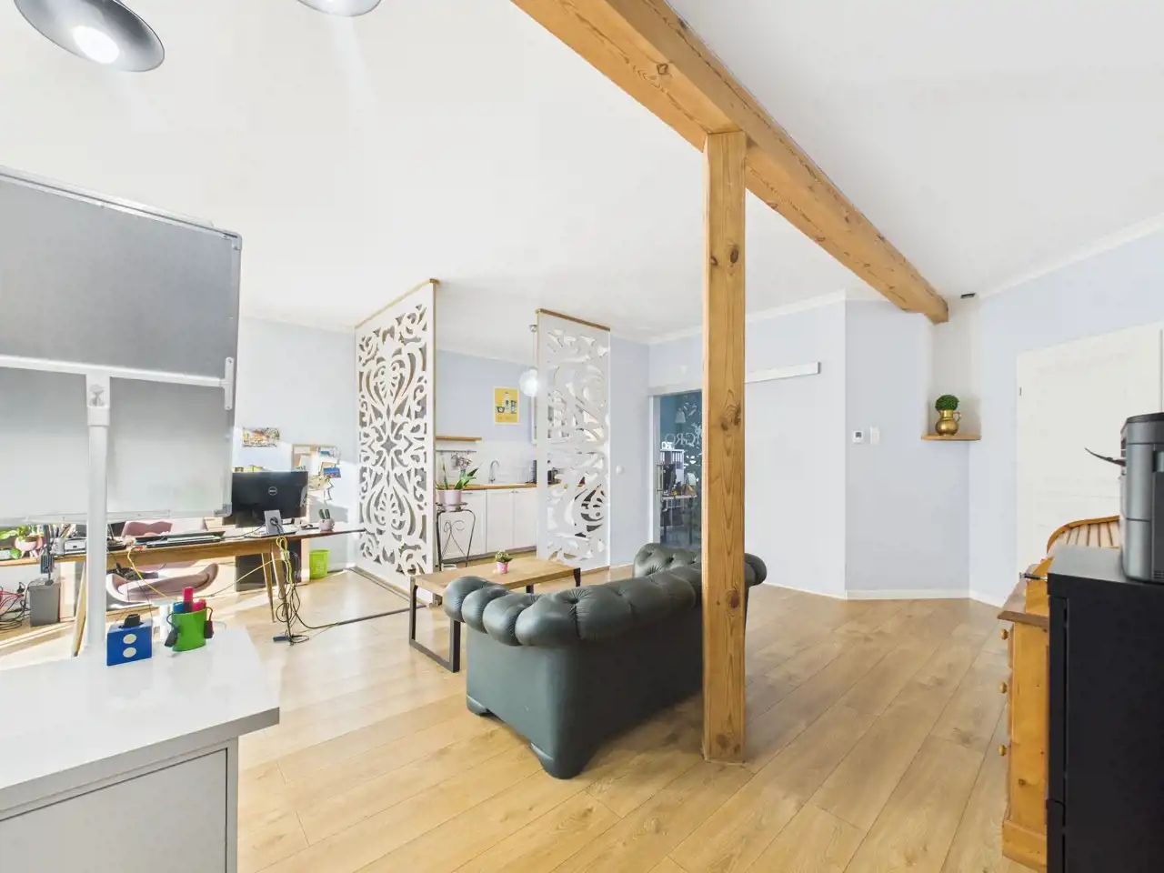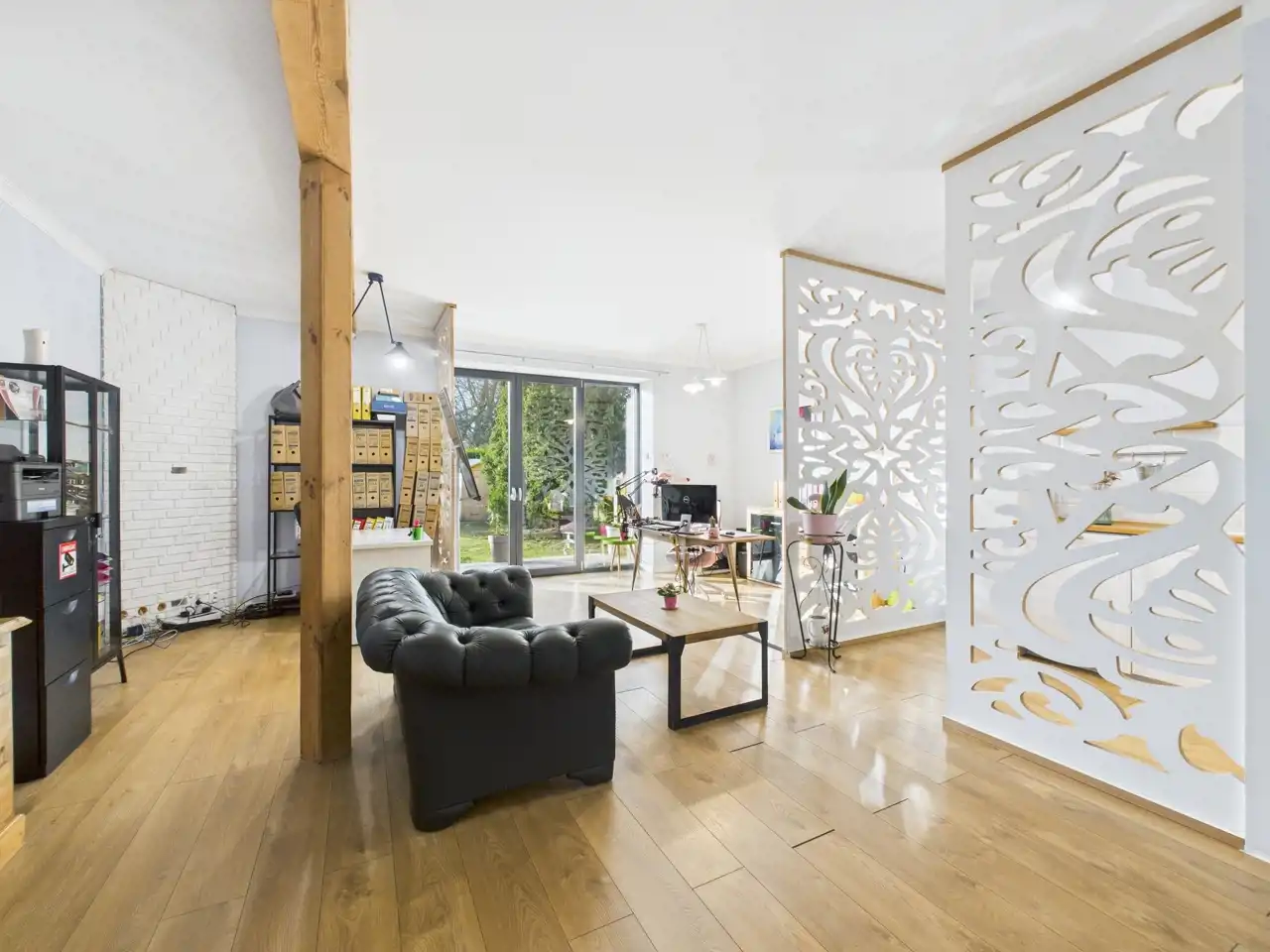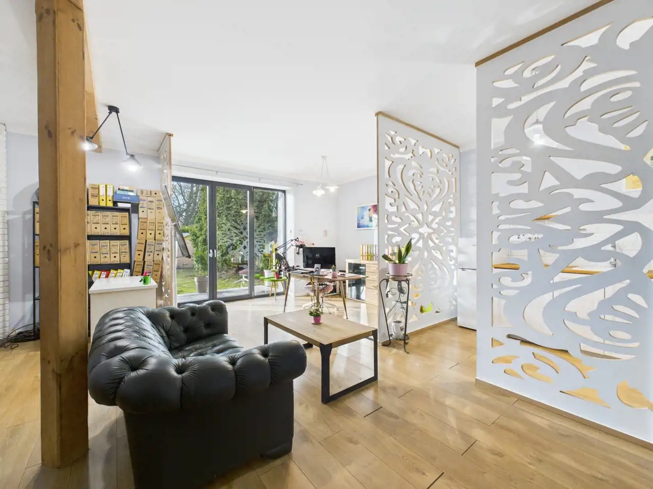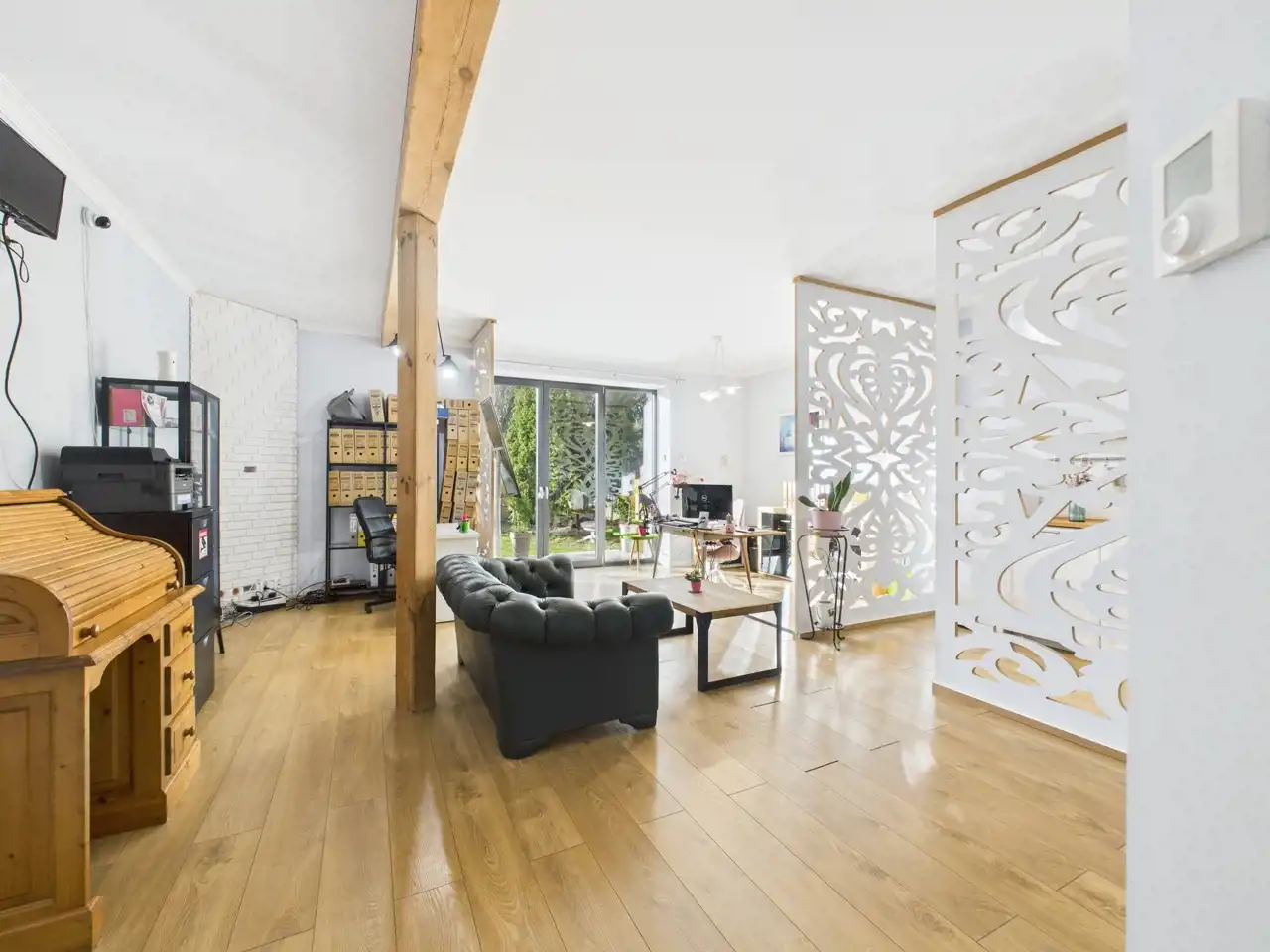 - mniejszego pomieszczenia, które również może służyć jako pomieszczenie biurowe, z wnęką na piec gazowy/miejsce do przechowywania,