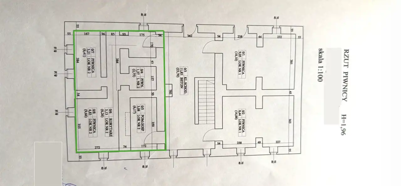 Wysokość pomieszczeń piwnicznych: ok. 1,96 m