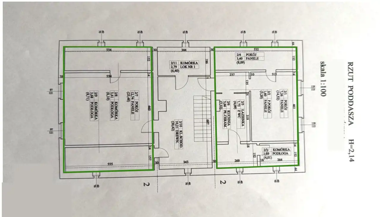Wysokość pomieszczeń: ok. 2,14 m