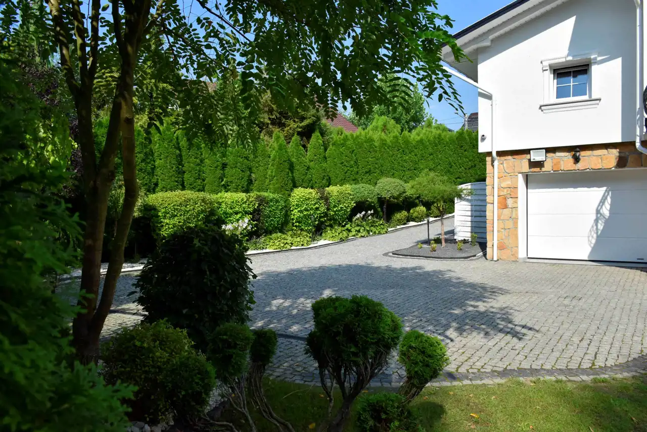 - Działka -kształt trapezu o wymiarach 20mx 35mx 29m x35m, ogrodzona, ogrodzenie frontowe kute, brama wjazdowa na pilota. Komunikacja około 350m2 wyłożona kostką grnitową. Działka atrakcyjnie położona, na delikatnym wzniesieniu, z sąsiedztwem doliny ze strumykiem. Ogrodzone jest 845m2, ale do użytku właścicieli jest pas zieleni przy strumyku, do którego prowadzą kamienne schodki