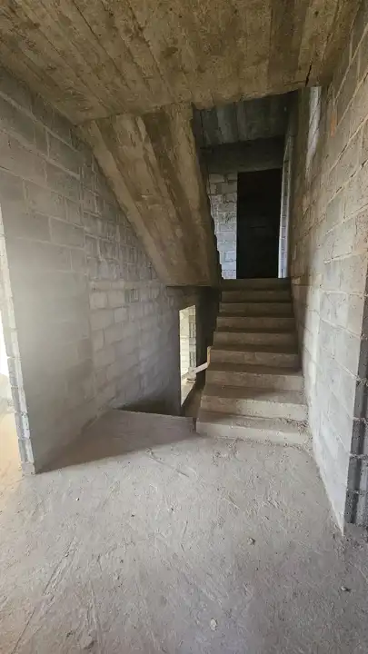 Dom jest dwukondygnacyjny i ma piwnicę. Stropy są lane, a w środku znajdują się już wylane schody betonowe, co zapewnia trwałość i wytrzymałość konstrukcji. Dach jest dwuspadowy, odeskowany i pokryty papą, co zabezpiecza budynek przed warunkami atmosferycznymi.