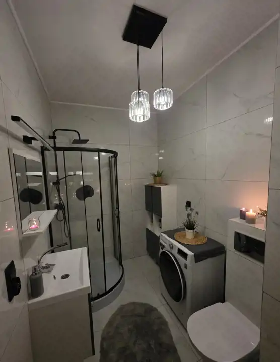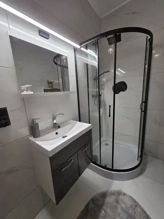 - Łazienka o powierzchni 4,8 m² wyposażona w prysznic.