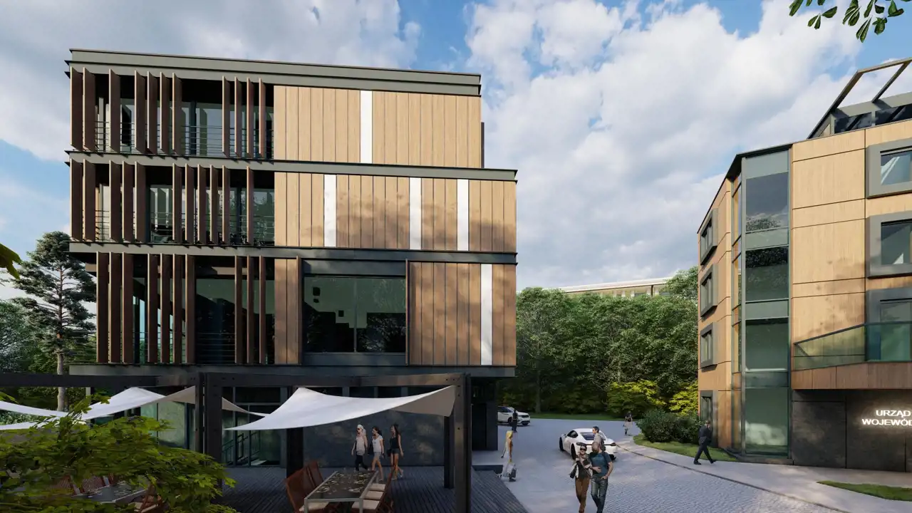 Nowoczesna bryła trzypiętrowego budynku położona jest bezpośrednio przy rzece Odrze.