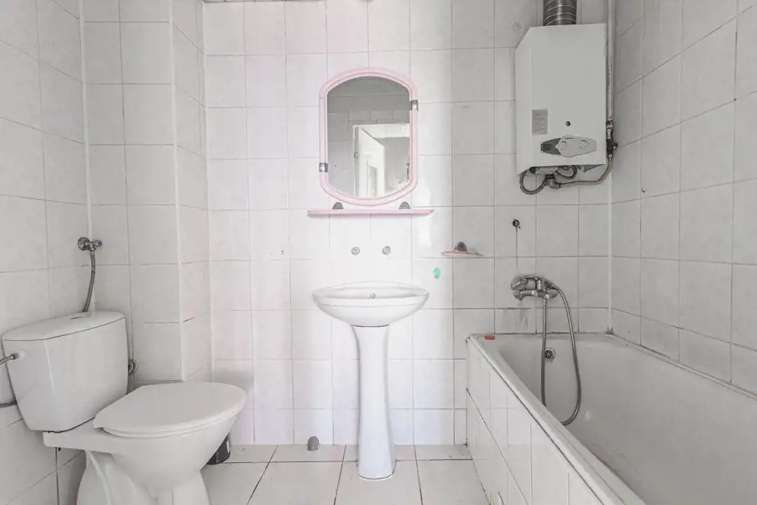 Ogrzewanie z sieci miejskiej, ciepła woda z piecyka gazowego.