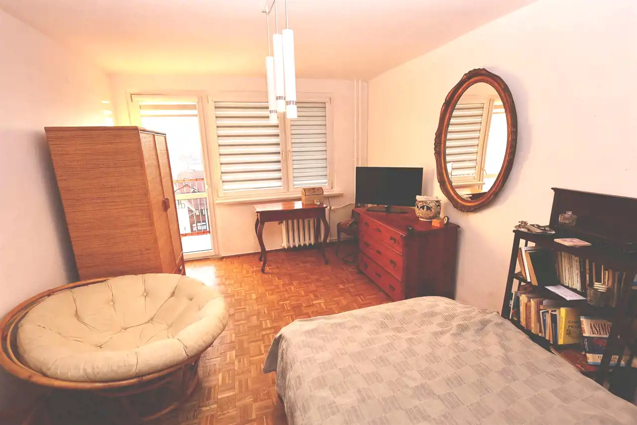 Salon z klimatem: Przestronny pokój dzienny z oryginalnym parkietem w jodełkę, który nadaje wnętrzu charakteru. Z salonu wyjście na balkon, z którego rozpościera się widok na okoliczną architekturę.