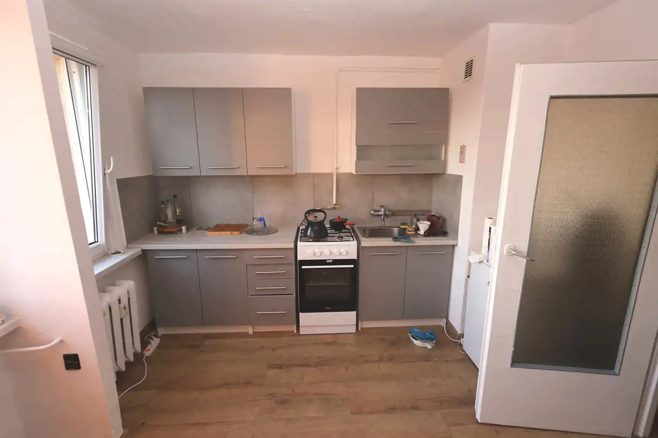 Nowoczesna kuchnia z jadalnią: Oddzielna, jasna kuchnia z dużym oknem. Wyposażona w nowe meble w modnym szarym kolorze, kuchenkę gazową z piekarnikiem oraz miejsce na stół z krzesłami – idealne na wspólne posiłki przy zachodzącym słońcu-istnieje możliwość wydzielenia Kuchni jako osobnego pomieszczenia.