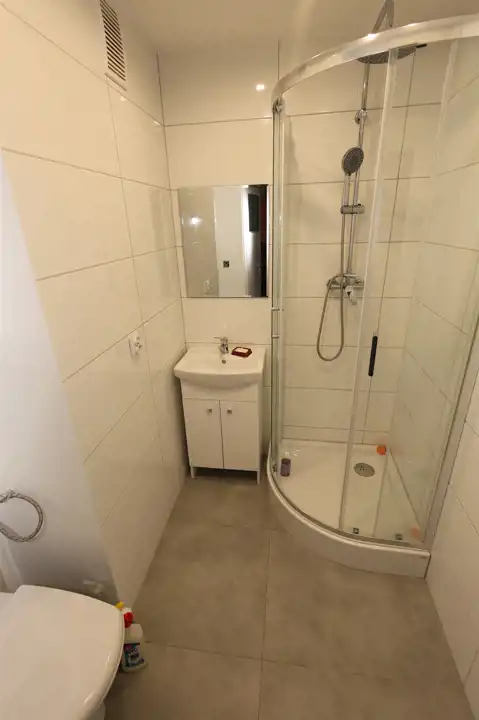Łazienka po remoncie: Wykończona w jasnej kolorystyce, z nowoczesną kabiną prysznicową, umywalką z szafką oraz nową armaturą.