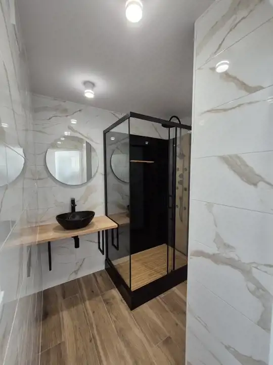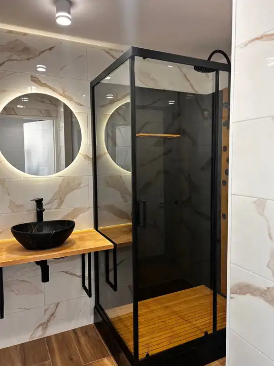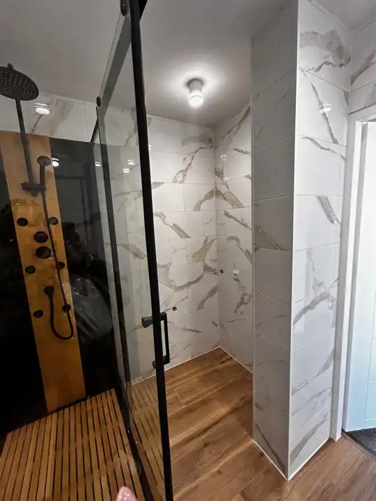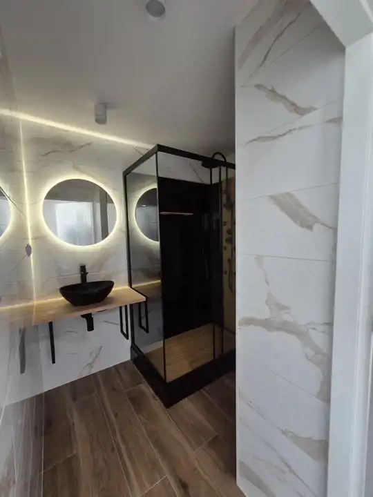 Piękna łazienka z dużą kabiną prysznicową, osobno toaleta.