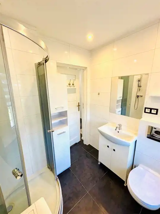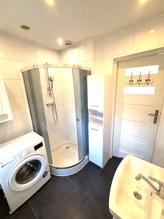 Łazienka z pralką i kabiną prysznicową