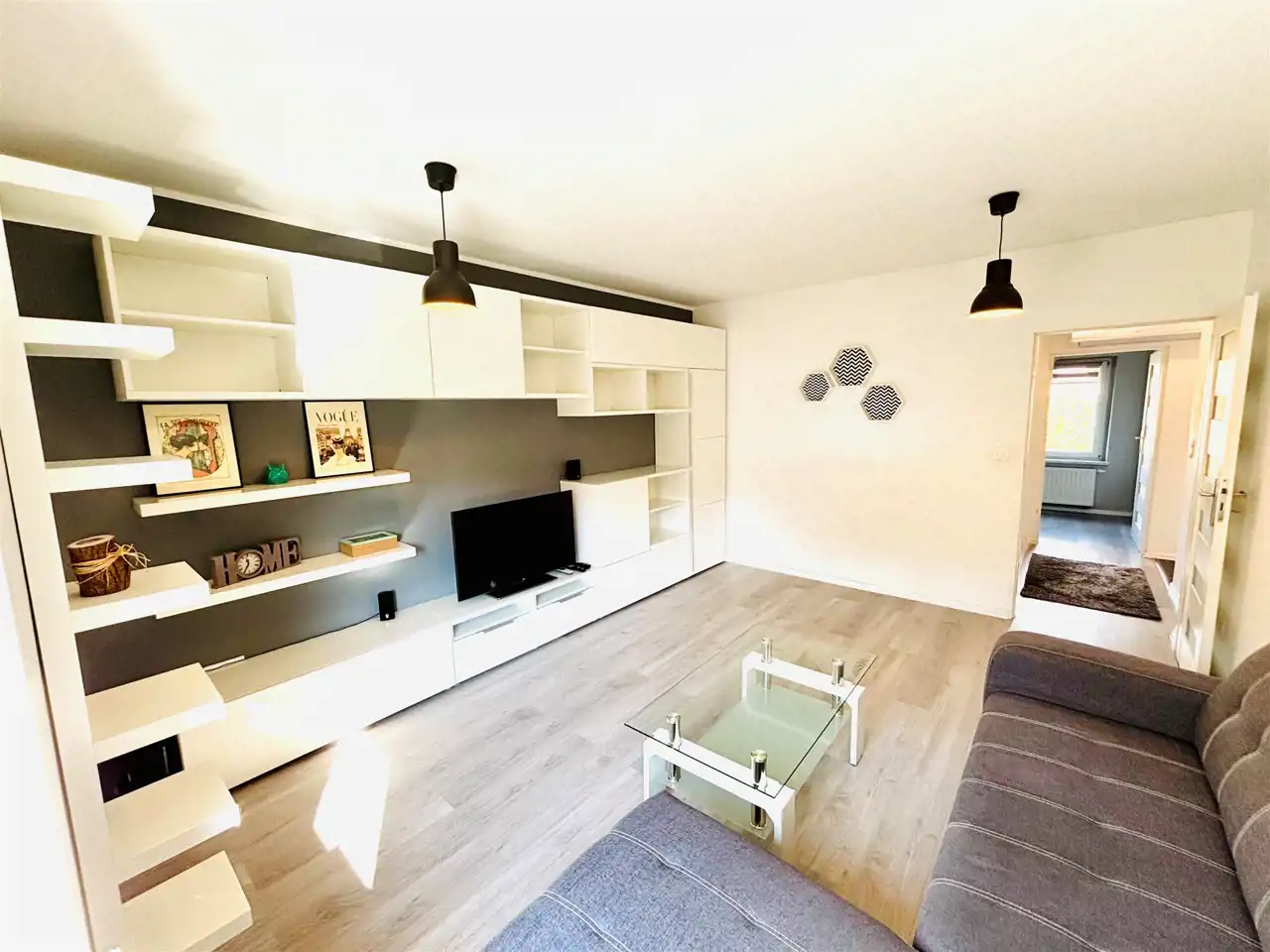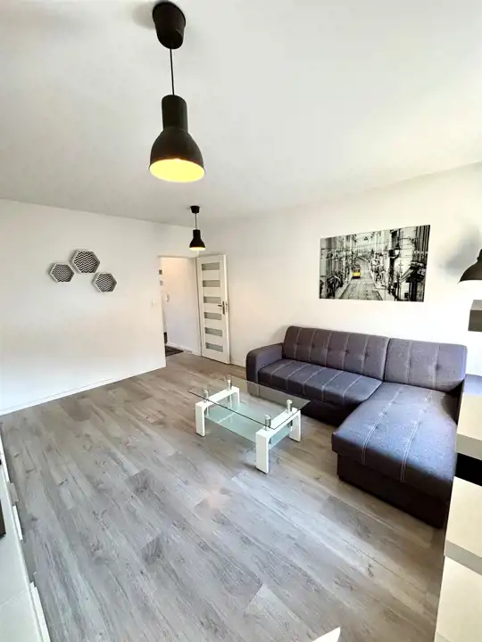 2 Pokój duży z meblami i rozkładaną narożną kanapą.